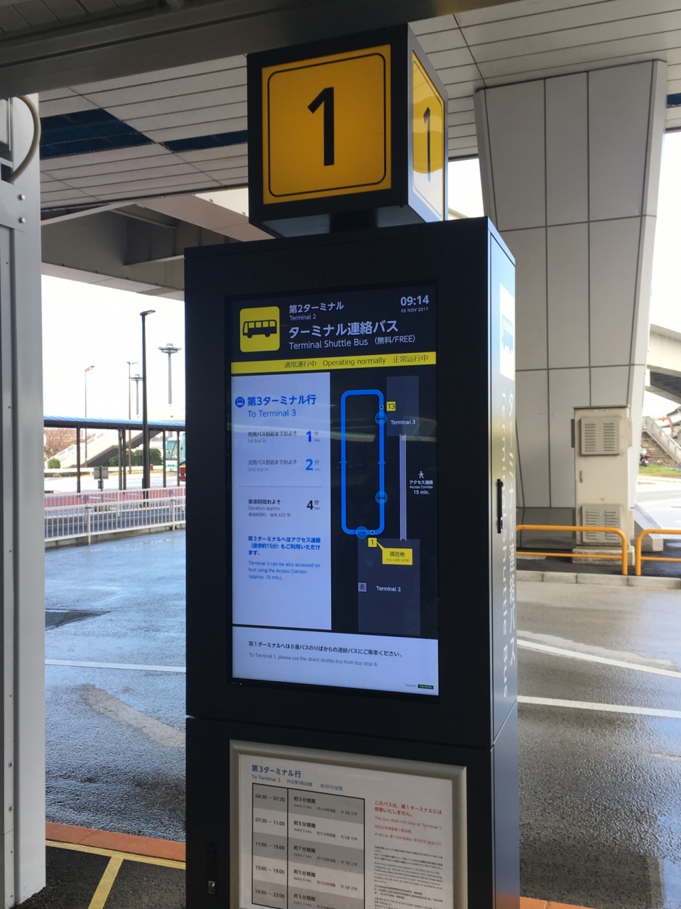 第2ターミナルから第3ターミナルまでは500m強あるそうで、第2ターミナル前の1番バス停から黄色の車体の無料第3ターミナル連絡バスを利用し所要時間5分弱で到着できました。運行間隔は3-5分で待ち時間のストレスはありませんでした。
