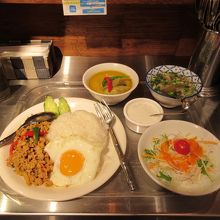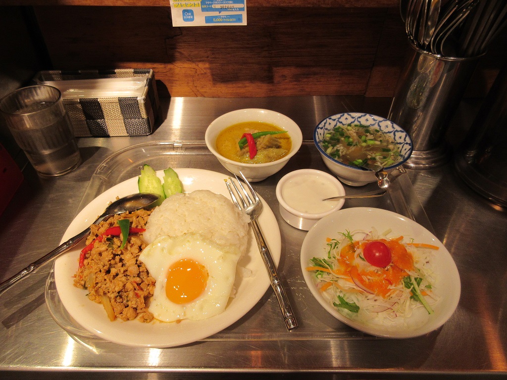 新宿ルミネ1の地下に入っているタイ料理のお店です。以前はゲウチャイというタイ料理店があった場所です。バンコク屋台と名前が付いている通り、屋台を彷彿とさせる狭いカウンター席に座り、グリーンカレーの定食をオーダーしました。サラダやスープもついてなかなかお得。