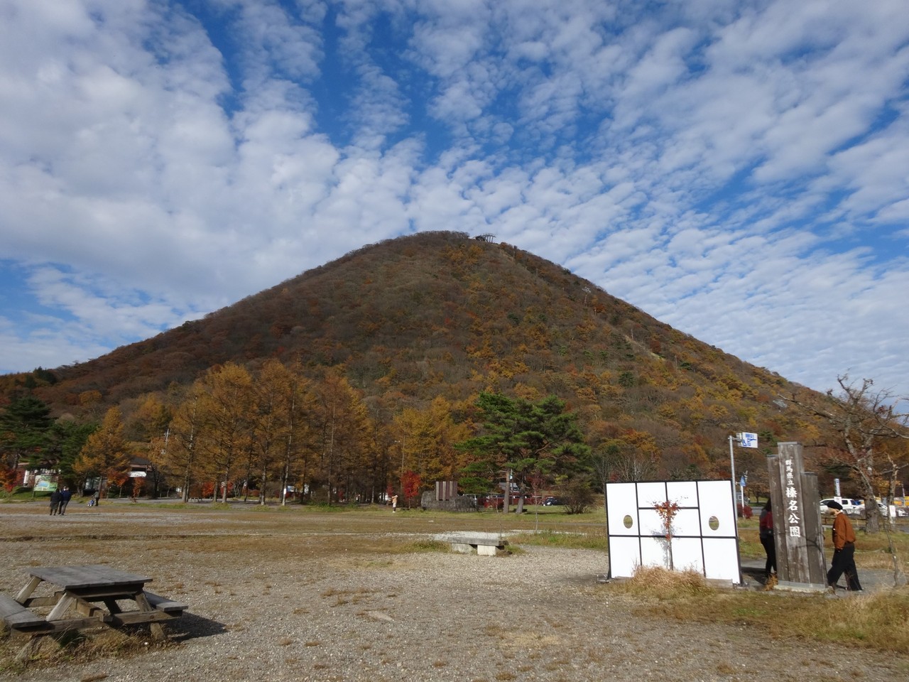 11月上旬が紅葉の見頃との情報を得て、行ってきましたが少し早かった様で赤い木はチラホラと行った所。幸いお天気に恵まれ、綺麗に写真は撮れました。榛名山は別名「榛名富士」と言われるのも納得の形。ミニ富士山のようでした。榛名公園という看板が立っているので、そちらを入れて写真を撮るのがオススメです。