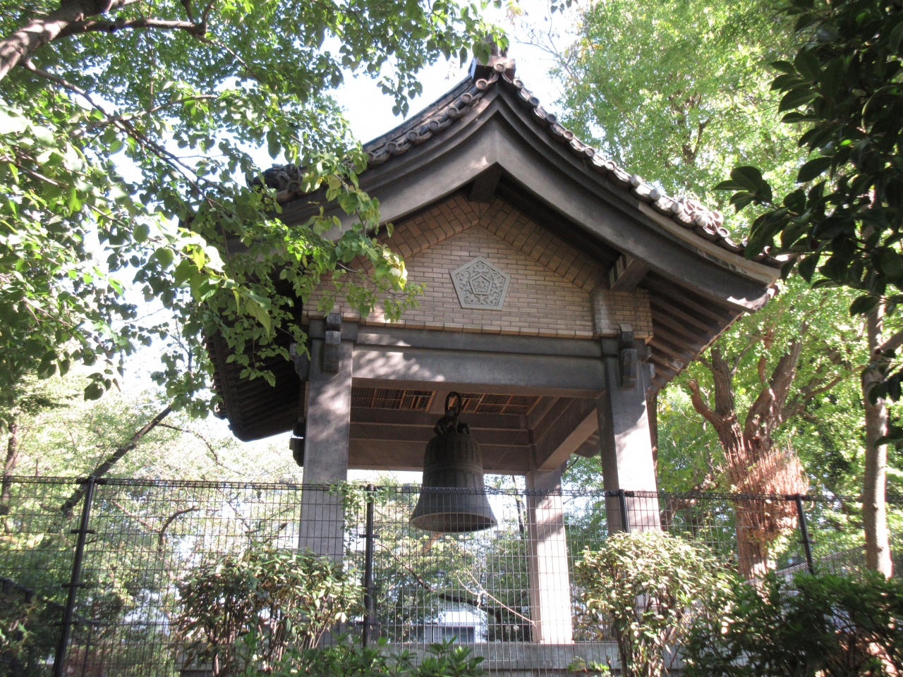 JR両国駅から徒歩10分の横綱町公園内にあります。東門近くの公園管理所そばに鐘楼と幽冥鐘があります。関東大震災で亡くなった方を追悼するために、中国仏教徒から寄贈されました。中国で鋳造された鐘は1925年に中国から運ばれました。国内の鐘と形が異なり、裾が拡がる曲線のきれいな鐘です。どのような音色なのか、どのくらい響くのかと気になりましたが、柵に囲まれて遠くから見るだけでした。中国から寄贈されたことに意味があると思います。