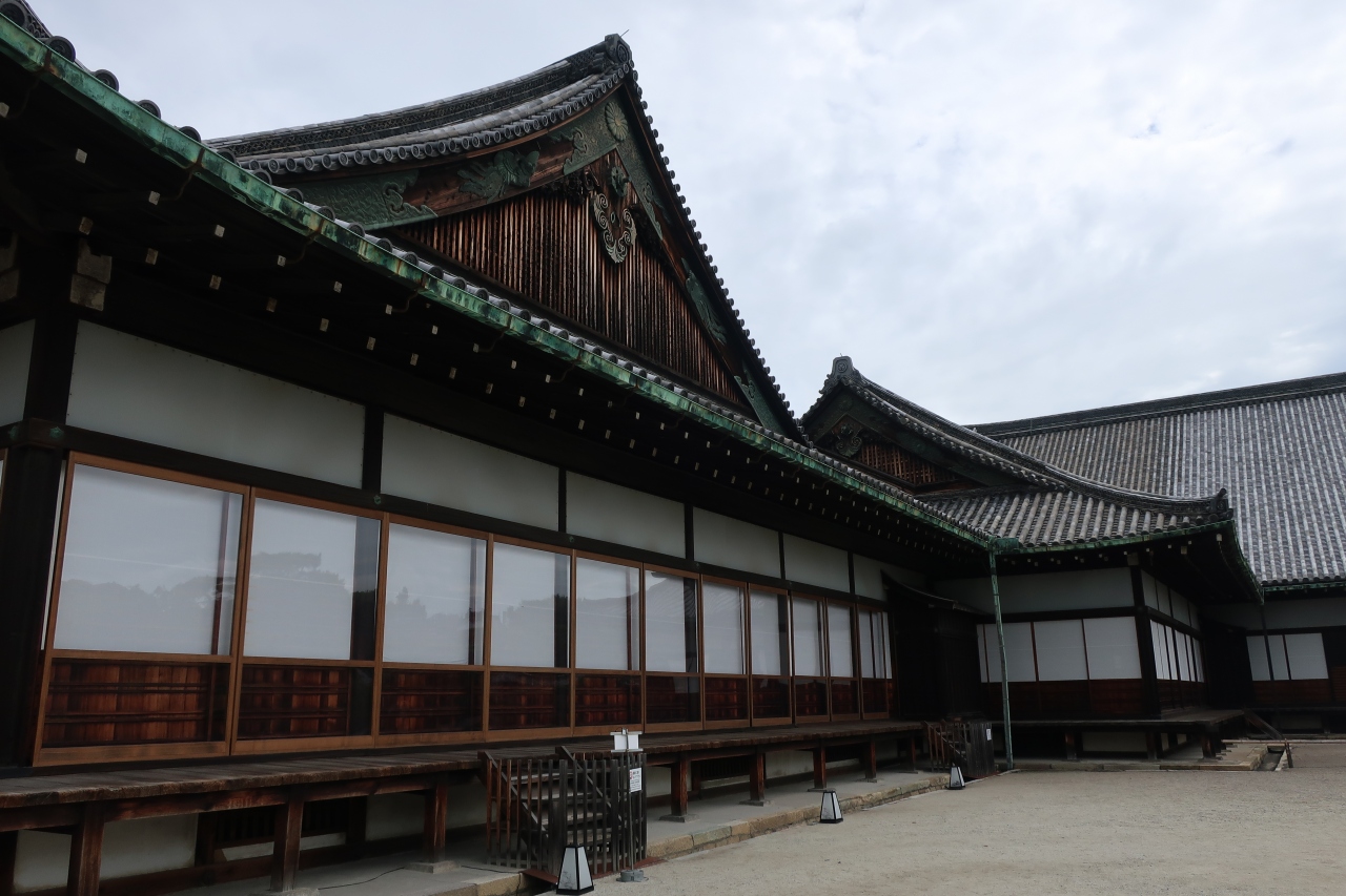 元離宮二条城の一番の見所が唐門を潜った先に見えて来る二の丸御殿です。将軍の執務の御殿として使われていた建物で、徳川慶喜が大政奉還を行ったのが二の丸御殿の大広間です。大広間以外にも黒書院、白書院等があり、松、虎、豹等が描かれた襖等装飾も素晴らしく、まさしく御殿です。とても広く見所が沢山あるのですが、すべて内部は撮影禁止です。
