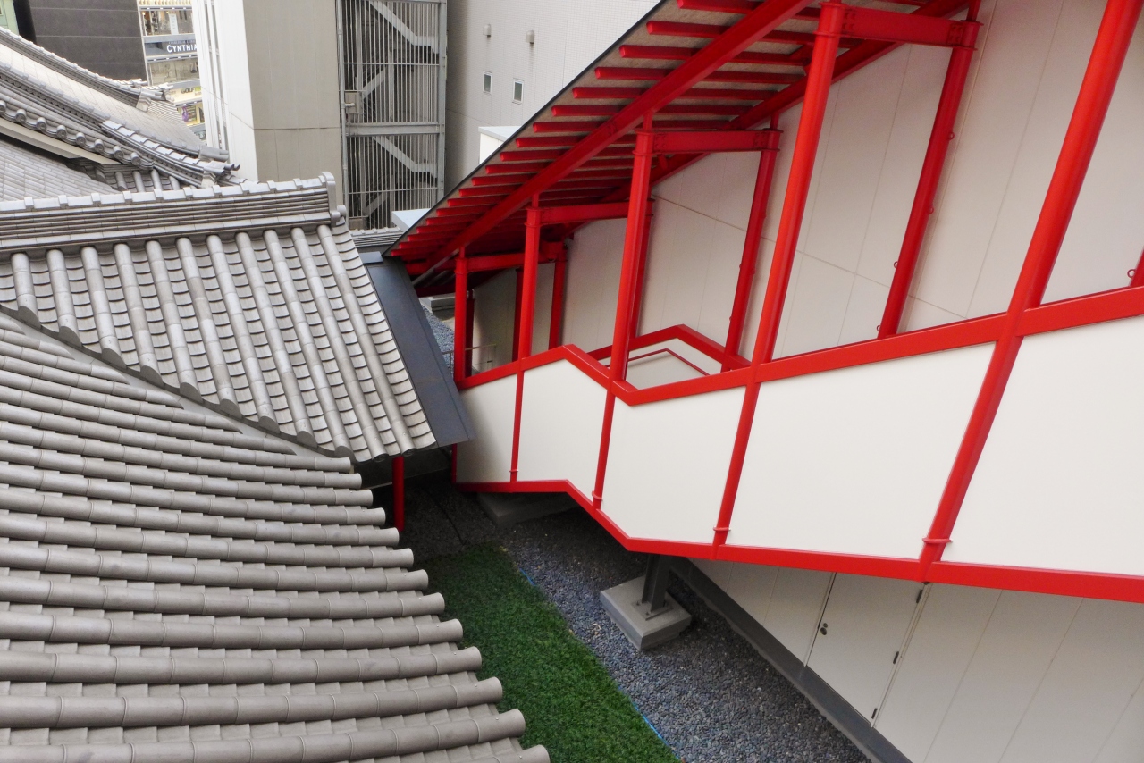 歌舞伎座タワーの5階にある屋上庭園へ行ってみました。5階から4階の回廊ギャラリーへ降りる派手な朱色の階段がありました。