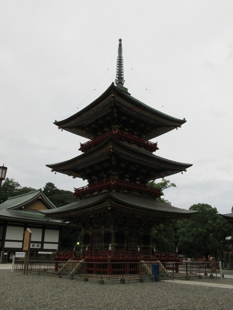 成田山新勝寺の仁王門をすぎて石段を上がると右手に見えるのが、江戸時代に建てられた三重塔です。朱色に塗られた欄干や、軒下に見える組手など豪華さが際立つ三重塔で、重要文化財に指定されています。本堂以上に、こちらの三重塔が気に入りました。