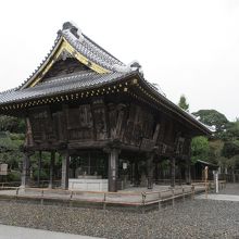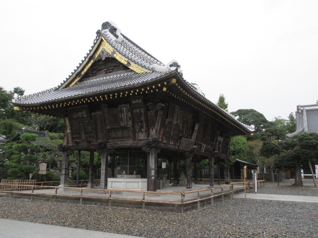 大本堂を見学後、左に迂回しつつ一段高い場所に上がると、光明堂や平和大塔の少し手前に、信徒から奉納された額や絵馬を飾る歴史ある額堂という建物がありました。国の重要文化財に指定されていて、七川団十郎の像なども置かれていました。見ごたえのある私好みの建築でした。