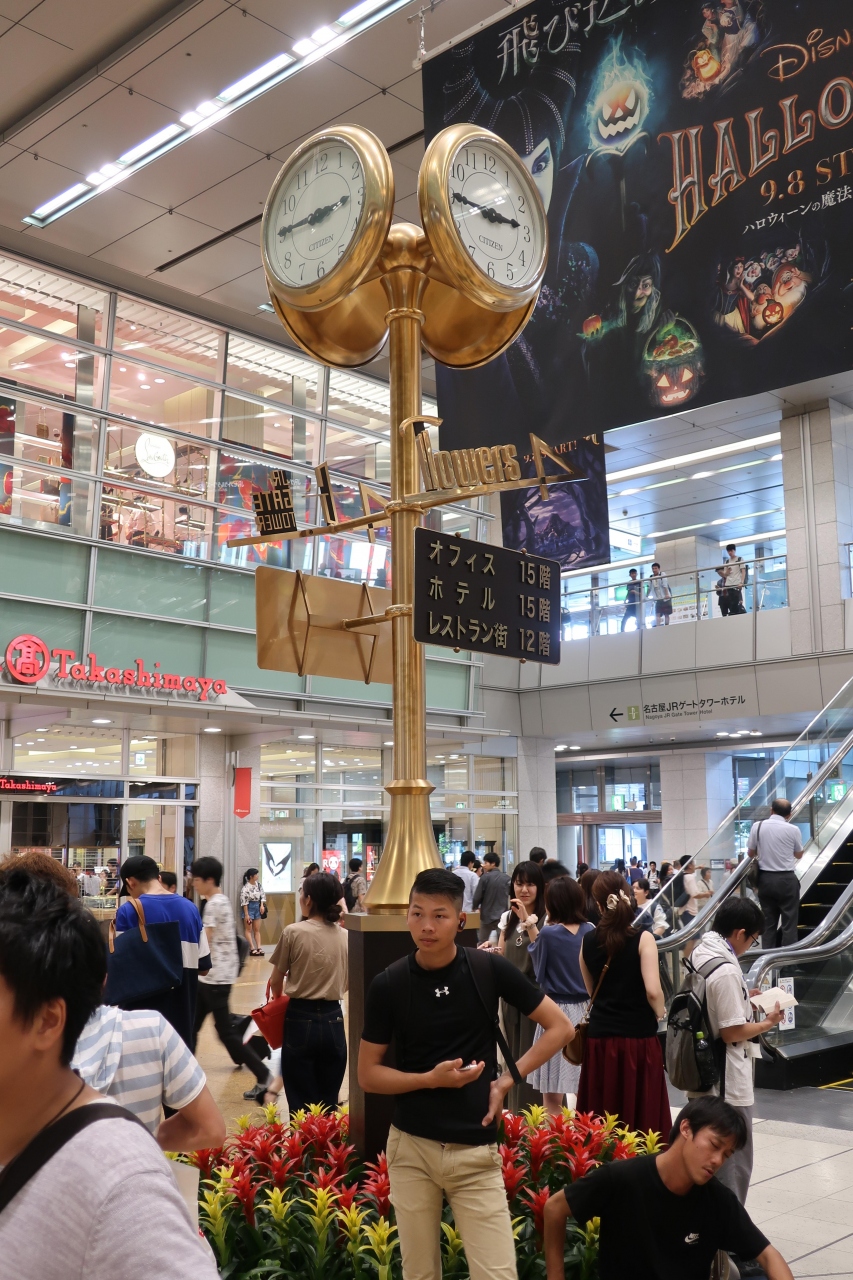 JR名古屋駅の中央コンコースを桜通口の方へ行った所にある広場の中央に金の時計はあります。支柱の上に4面時計が付いた金の時計は観光地と言うより待ち合わせ場所として超有名。JR、名鉄、近鉄、地下鉄からも行き易く、高島屋、名鉄百貨店、JPタワー等の人気スポットへアクセスが良いので、いつ行っても混んでます。