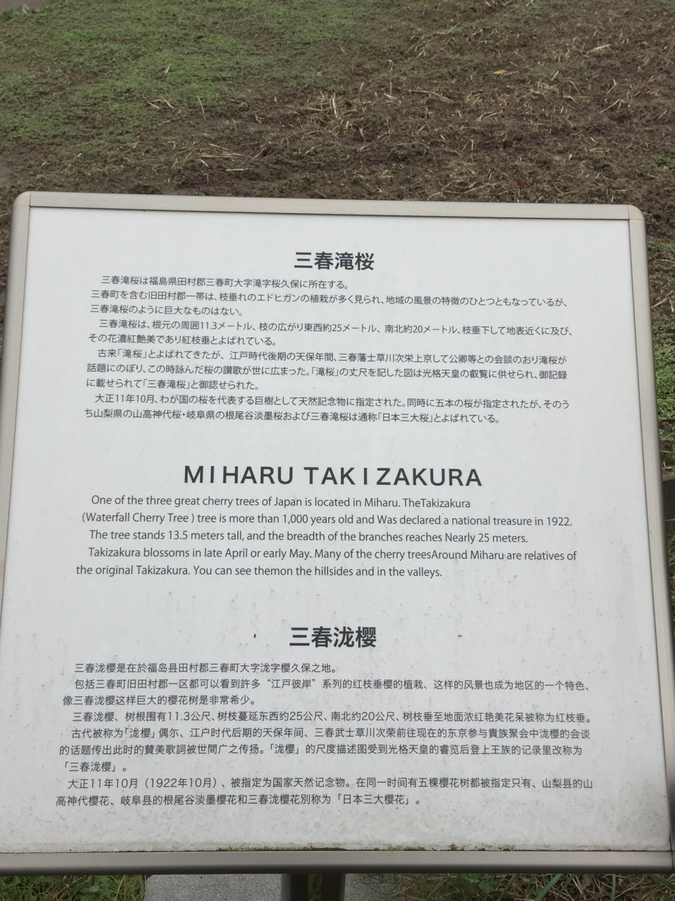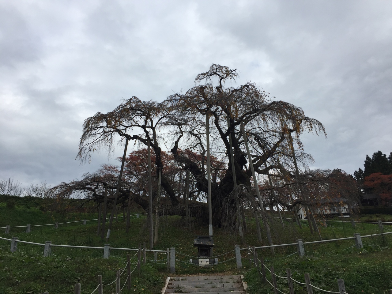 近くの山は紅葉シーズンでしたが、三春滝桜は葉っぱ1割を残してほとんどが落ちていました。日本三大桜の1つでとても大きな木です。昔の殿様がここまで来て桜を見物していたそうです。今も大事に守られて毎年綺麗な花を咲かせている事でしょう。