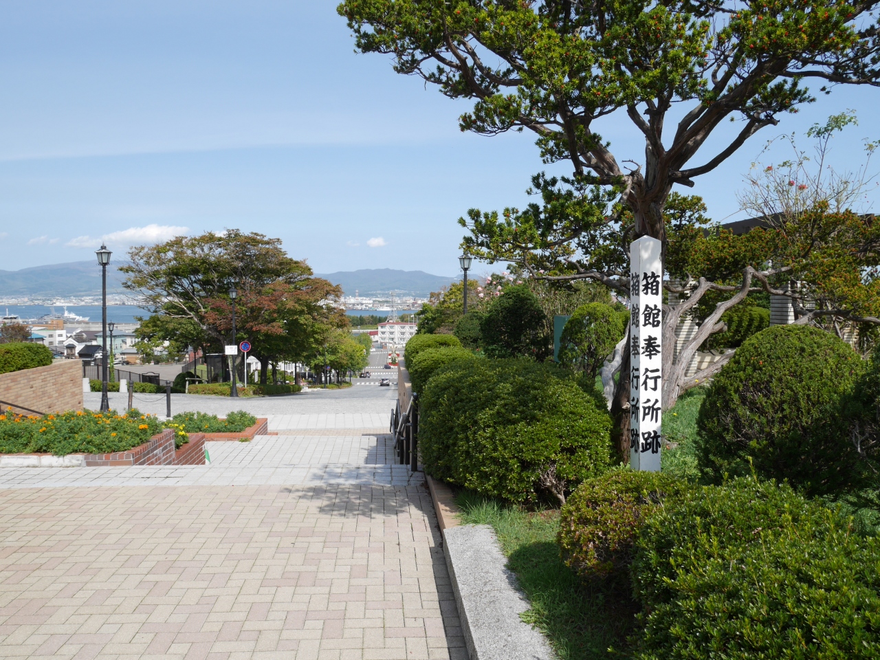 函館の観光スポットの中心地、元町にある公園で、旧函館区公会堂からも歩いてすぐです。坂の上にある公園なので、函館市街や海を眺めることができて、非常に美しいです。かなり整備されているので景色を見ながらゆっくりくつろぐこともできそうでした。