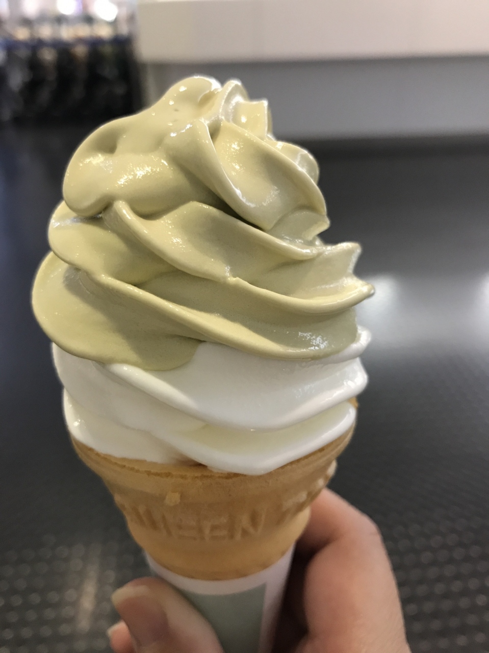 神戸空港の1階フロアにある神戸六甲牧場です。こちらでは、ピスタチオソフトクリームを販売しています。ピスタチオミックスソフトクリームが500円とソフトクリームにしては、かなりよいお値段です。ピスタチオが濃厚で甘いです。