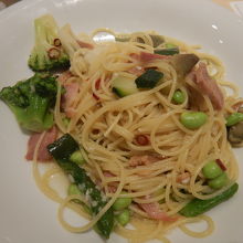 彩り野菜のペペロンチーノ、サラダバー、スープバー付きで1390円+税(1501円)。サラダバー抜きの注文はできない。味は悪くないけど、パスタの量は少ない。その分はサラダバーで満たしてねといった感じだ。