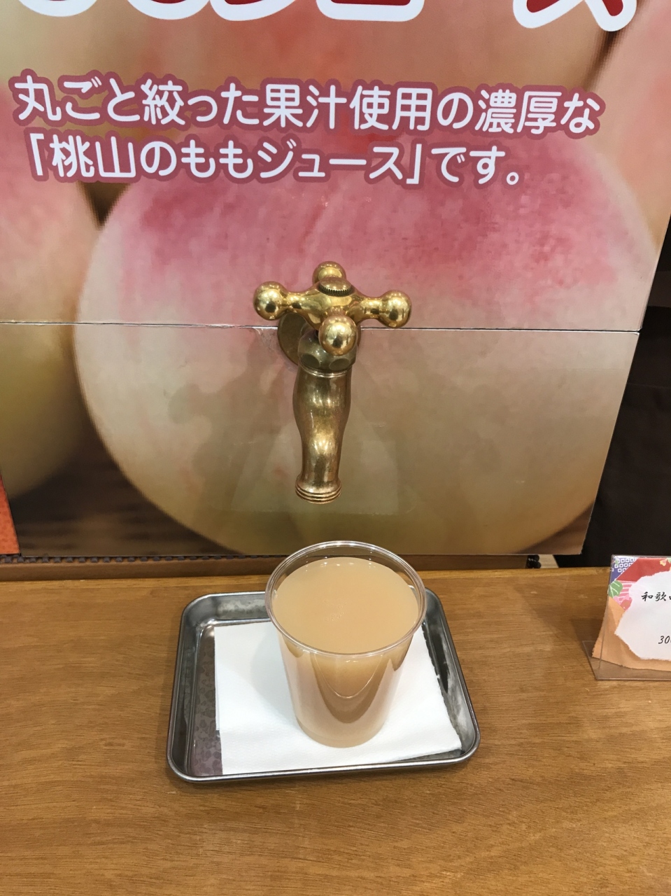 和歌山駅に直後しているMIOは2階フロアとJRの開催があるので、とても便利です。一階の和歌山お土産屋屋さんの天水屋酒店では、蛇口をひねるとジュースが出てきます。和歌山みかんとももジュースがあり、一杯300円です。