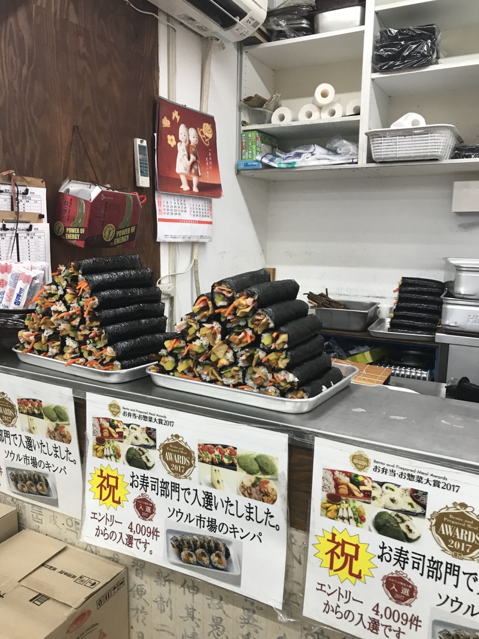 店の入り口にパジョンやキンパッを作っているところがあって、中に入るとキムチやタコのチャンジャ、チーズダッカルビの冷凍などなど目が輝いてしまうような美味しいものオンパーレドです。弁当類も充実しているので買って帰りお家韓国も楽しめますよ。