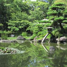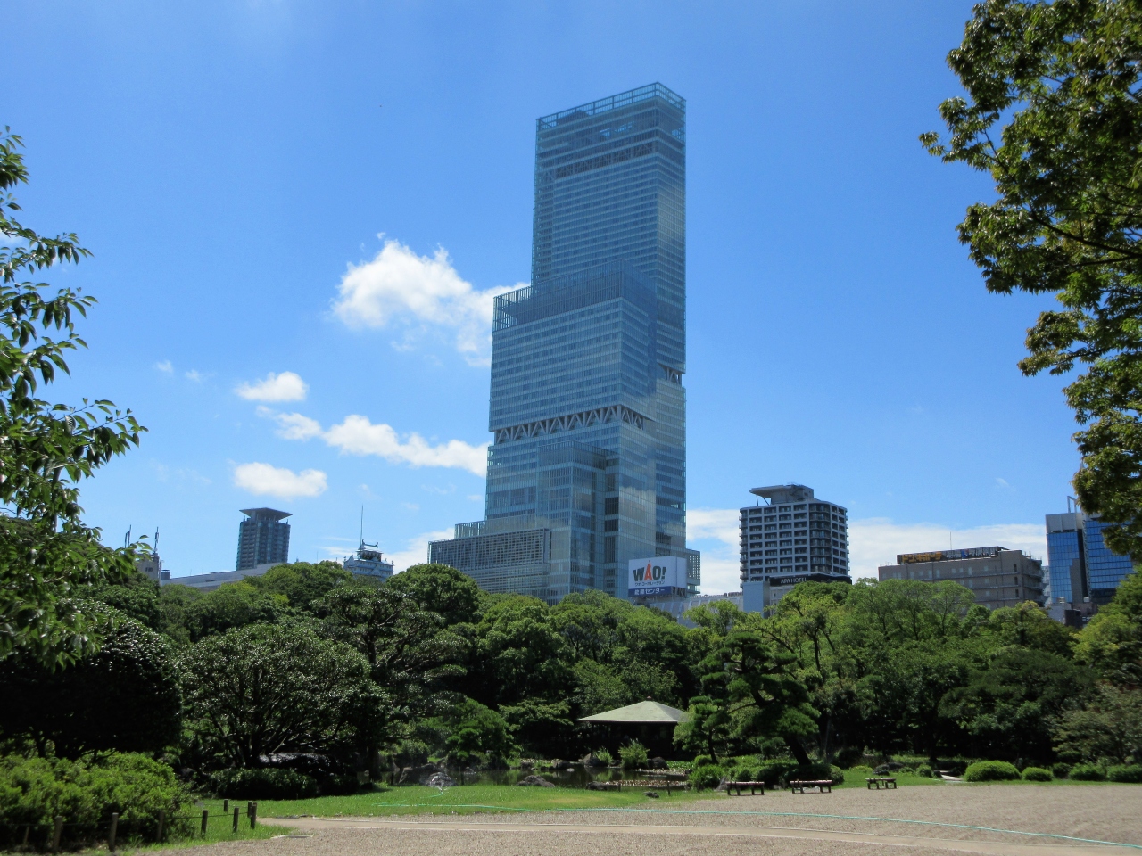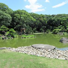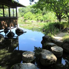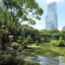池の周りを歩きながら庭園を1周回れます。池の向うにあべのハルカスが見えます。