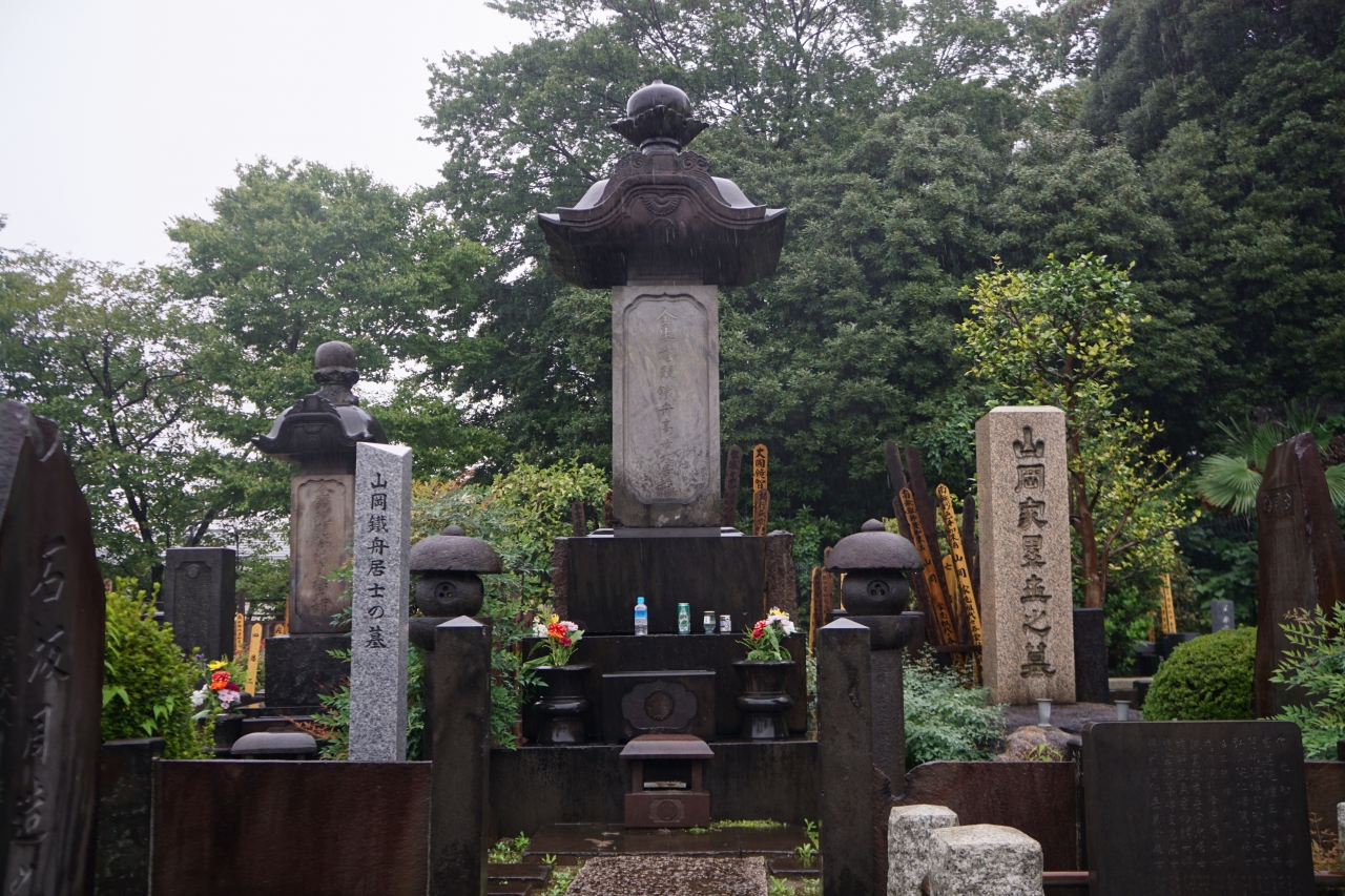 山岡鉄舟墓は、全生庵境内奥の共同墓地の一角。全生庵の門前に山岡鉄舟の説明板があって、それを確認してから墓の方に回りました。勝海舟と協力して江戸城の無血開城に功のあった人物。明治以降は天皇の側近として、重職を歴任しています。墓は唐破風をいただいた堅い印象のデザイン。ちょっと頑固な感じもしなくはありません。