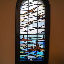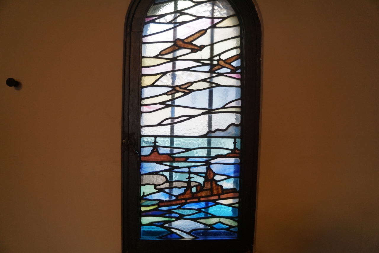 島薗邸は、月に二回公開されています。訪ねるとボランティアの方でしょうか。何人か詰めている人がいて、軽く案内もしてくれました。建物は、書斎・食堂のある洋館部分と居間のある和風建築部分の組み合わせ。これに、後に建て増したという二階部分が付いています。この辺りは空襲でほとんどが焼かれているのですが、この建物は奇跡的に難を逃れたのだとか。昭和初期の建築で贅沢はできなかった時代ですが、一部にステンドグラスも使ったりして、これがせい一杯のことだったんでしょう。ただ、ステンドグラスは戦艦と戦闘機。当時の風潮を示しています。