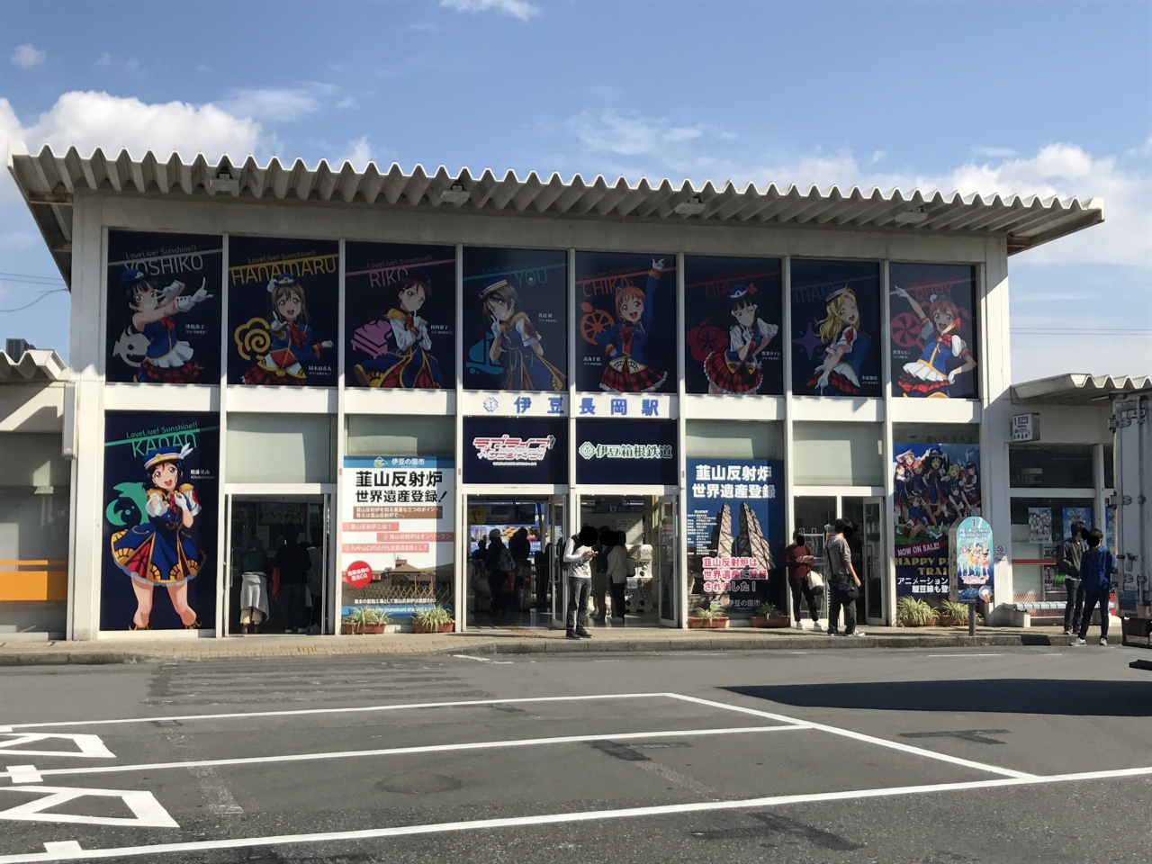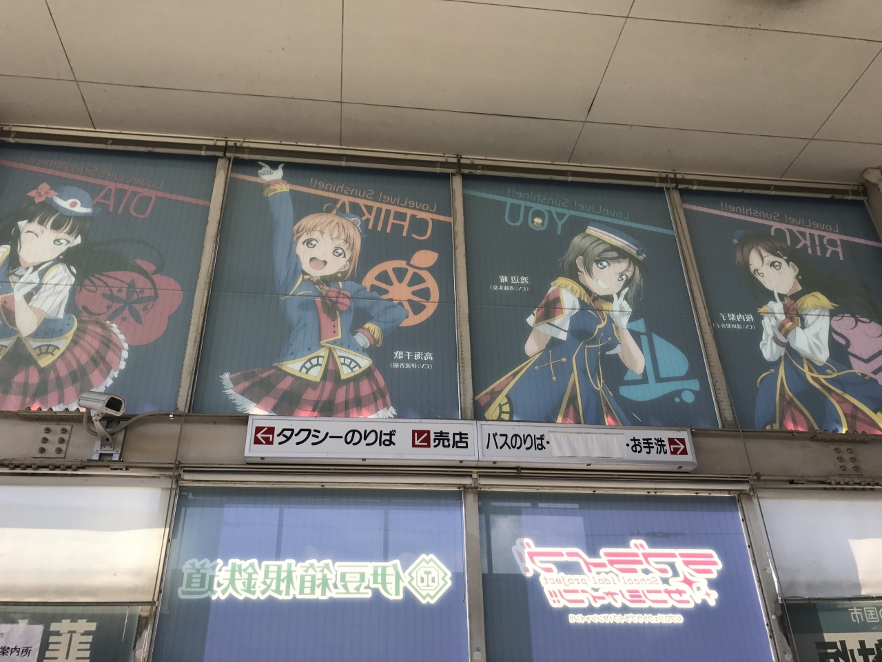 駅の建物にはラブライブ!サンシャイン!!のキャラクターのイラストが大きくラッピングされており、韮山反射炉の写真よりも目立っています。