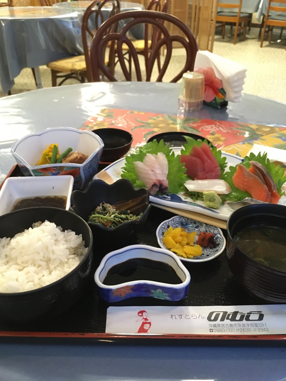 お土産屋さんや飲食店が並ぶ西里通りにあるレストランです。夕食でも定食メニューが食べられるお店を探していてこちらのお店にしました。ゴーヤーチャンプルー定食など沖縄風のメニューもありましたが、今回は刺身定食を選びました。値段は1500円ぐらいでした。それほど混んでなくて、ゆっくりと食事が出来て良かったです。