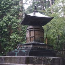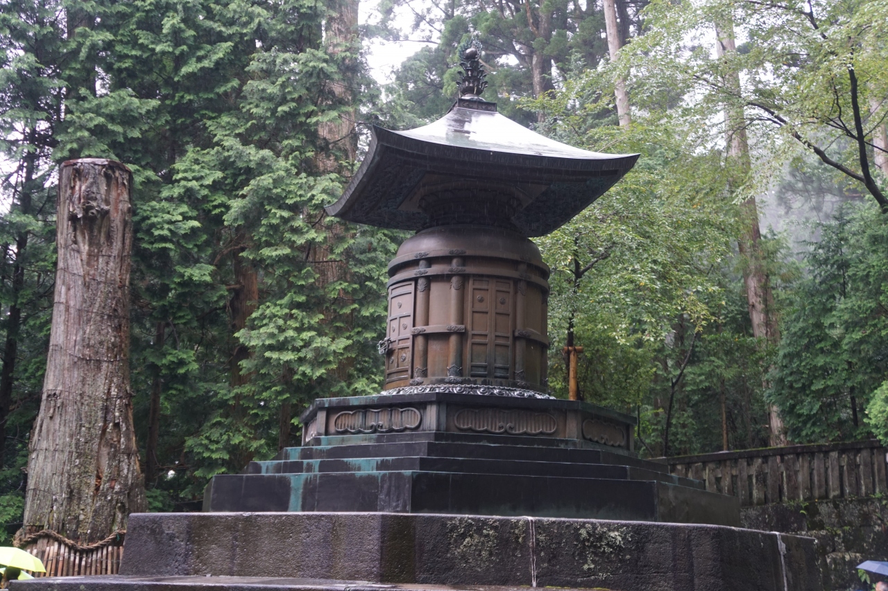 日光東照宮 奥社宝塔は、鋳銅製。方形造りの屋根に、よく見ると扉には南京錠が架かっていて、家康の神柩はこの下にあるはずなんですが、何かを収めているようです。