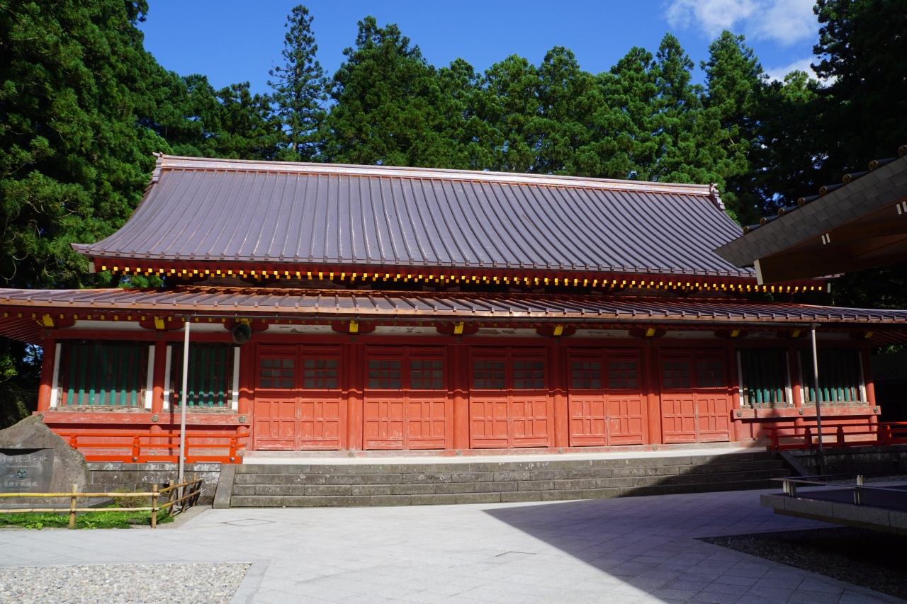 元々は、大正4年に東照宮300年祭を記念して建てられた参拝人休憩所だそう。それが昭和に入ってから日光東照宮奉納武道大会がここで開かれるようになり、増改築により武徳殿となりました。普段は外観を確認するしかありませんが、全面の扉を開けたらさぞ壮観だろうということは容易に想像できると思います。