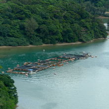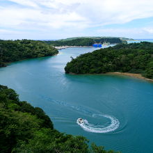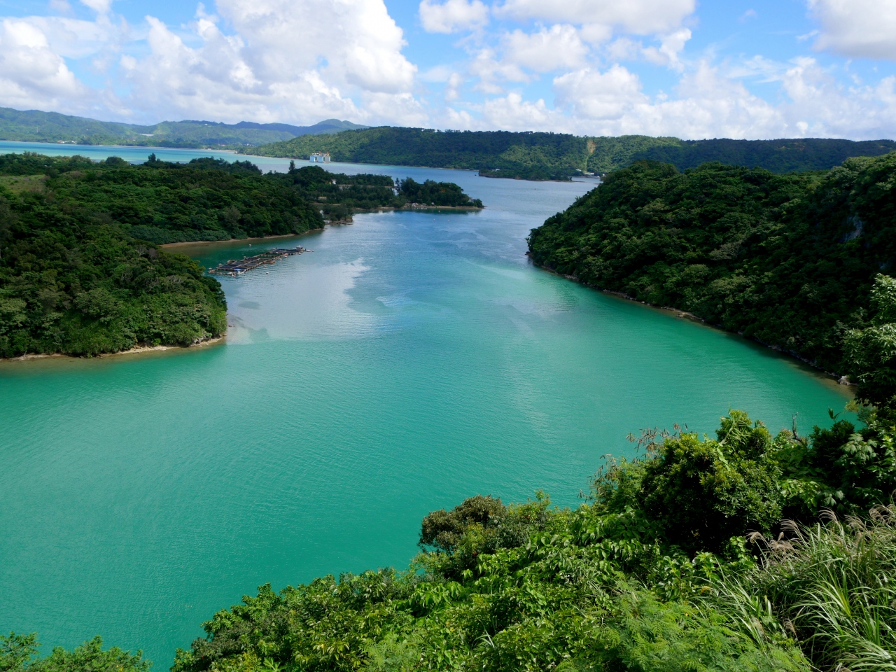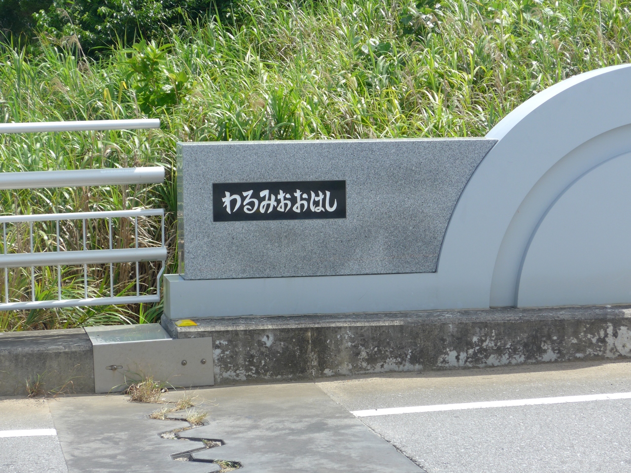 古宇利島の帰りには屋我地島からワルミ大橋を渡るとよい.小さな海峡になっていて,羽地内海と古宇利島が良く見える.特に古宇利大橋が屋我地島のむこうに見えるのは絶景だ.駐車場があり,橋の上には徒歩で行く.車に注意!