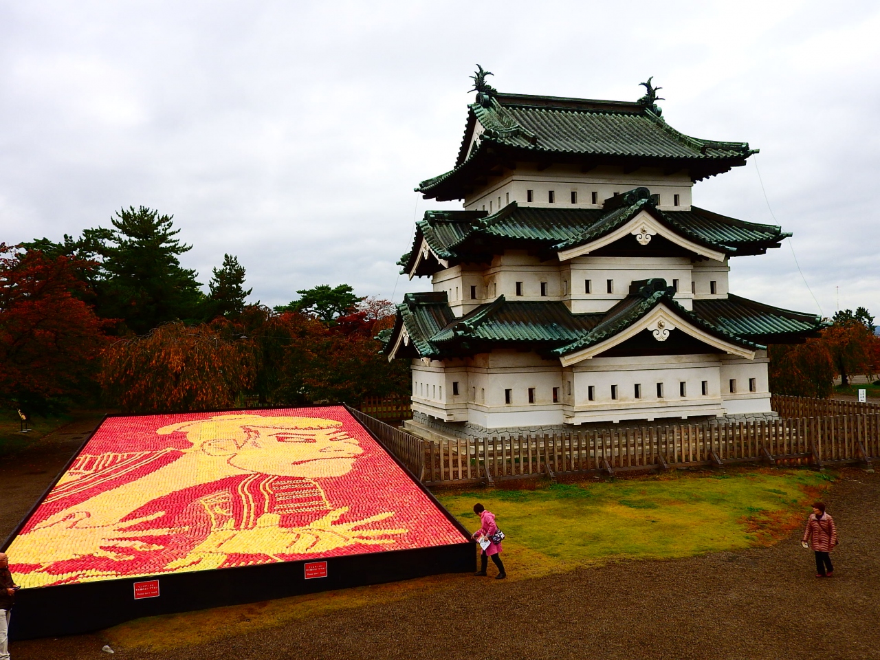 弘前城ガイドの方に,弘前城を訪れる人の大半が桜の季節に集中し,それ以外の時にどうやって集客するかが問題となっているという話しを伺いました.そのせいか,紅葉の季節にはリンゴアートや菊祭りなどを催していますが,やはり桜祭りの集客力には遠く及ばないようです.桜祭りにも訪れたことがありますが,殆ど身動きが取れないくらいの人出なので,自由に歩き回れる秋の催し物も十分楽しめると思います.