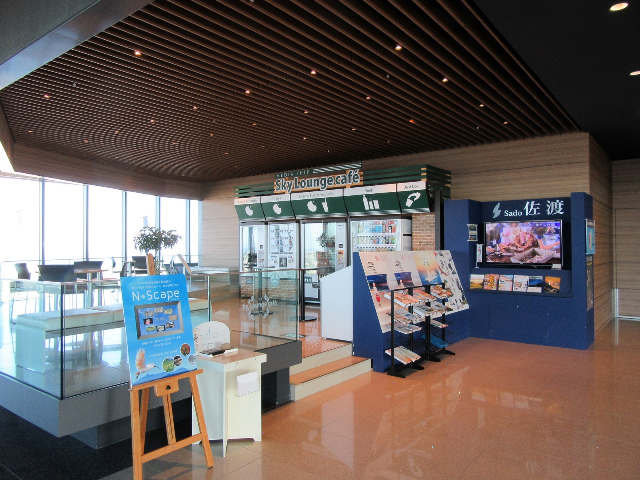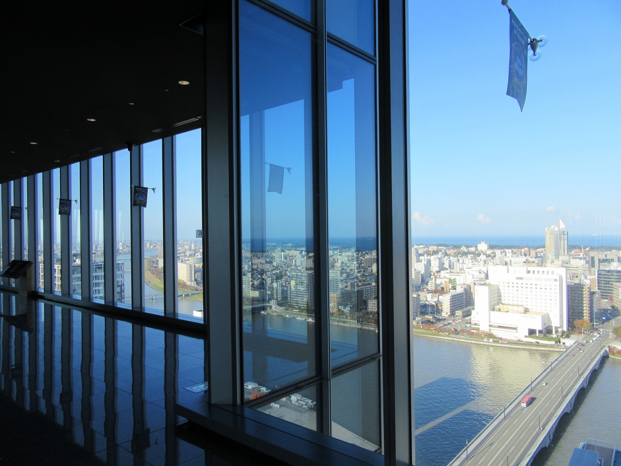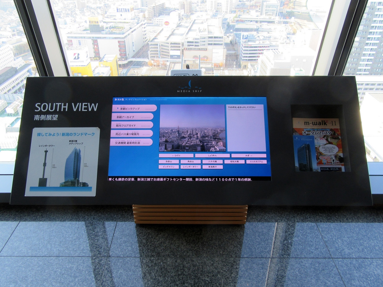 宿泊先の「ANAクラウンプラザホテル新潟」から徒歩で向った「新潟日報メディアシップ」です。地上100mにある展望フロアからの眺望を楽しもうと、利用開始時間の8:00に訪れました。2013年竣工という建物は美しく、その外観は北前船をモチーフにしたということですが、たしかに帆を張った風を受けているかのようです。さてエレベーターで20階に到着。ここから360度の眺めが楽しめますが、館内は床も壁もガラス窓もとても綺麗に保たれていて感動モノです。また各方角それぞれにはインタラクティブな案内表示板があり、屋外カメラ映像やアーカイブ画像なども楽しめます。各所で清掃も始まっていましたが、係の人の心得度も高く、こちらが構えているカメラの視界を常に気にかけていただくなど、申し訳ないほど気を利かせていただけました。雲一つない快晴の日に訪れることができたのも幸運でした。