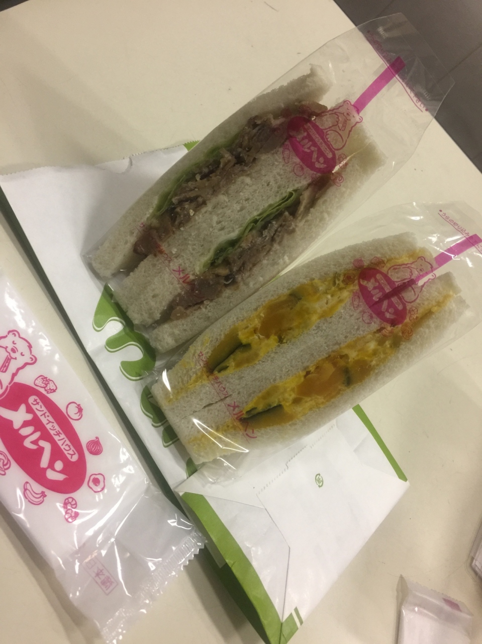夕方食べる用に豚のしょうが焼きサンド388円とかぼちゃサラダサンド324円を買いました。