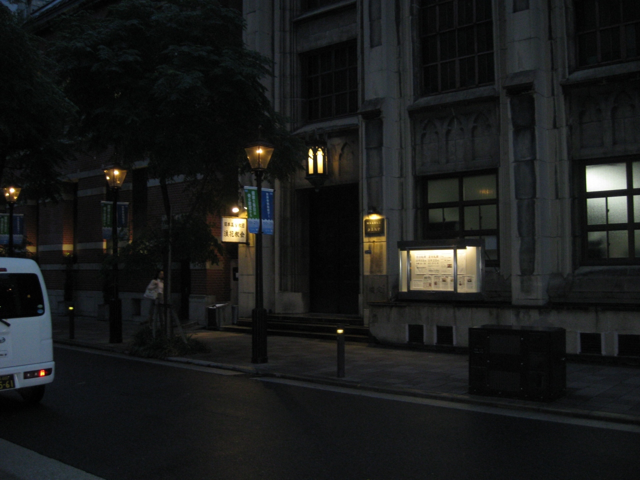 淀屋橋駅から東へ徒歩5分程、三休橋筋に面して建つプロテスタント教会。設立は1877年で当時は公会と呼ばれ、日本で最初の海外からのの援助を受けない「自給」教会として誕生しました。この三休橋筋には船場の繊維業を代表する綿業会館や八木商店の格式ある近代建築が数多く残っています。繊維華やかなりし頃の船場の風景が偲ばれる場所です。