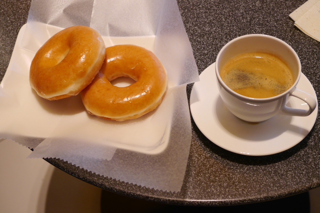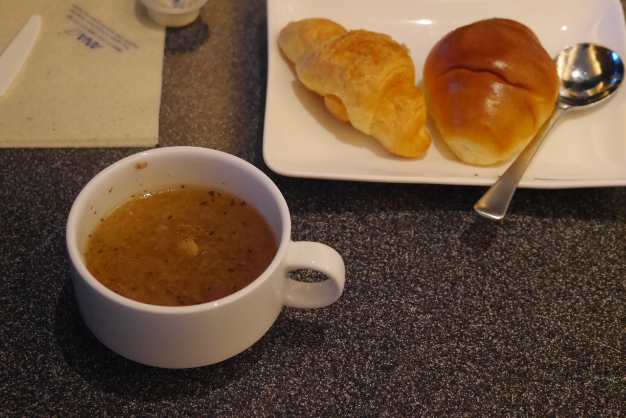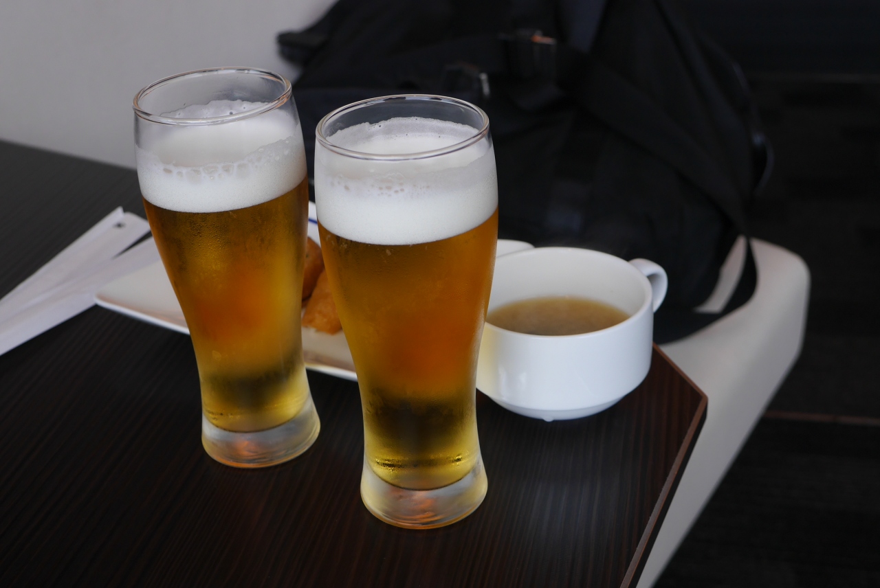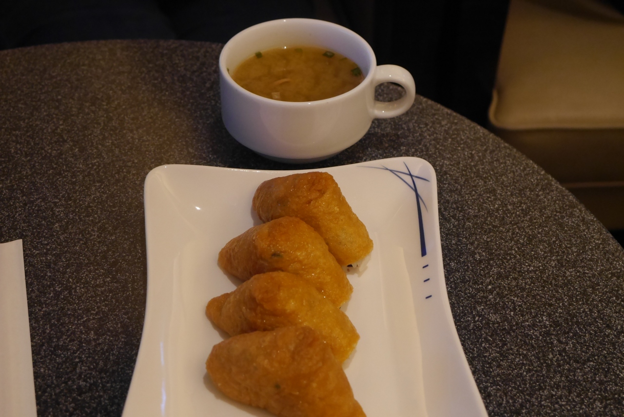 食事はパンとスープ若しくは稲荷ずしとみそ汁それぞれのセットは反対側にあるのでどちらにするか、決めてから座る場所を決めています。時間帯によってはドーナツも置かれています。ビールサーバーもありANAラウンジとは違う銘柄になっています。
