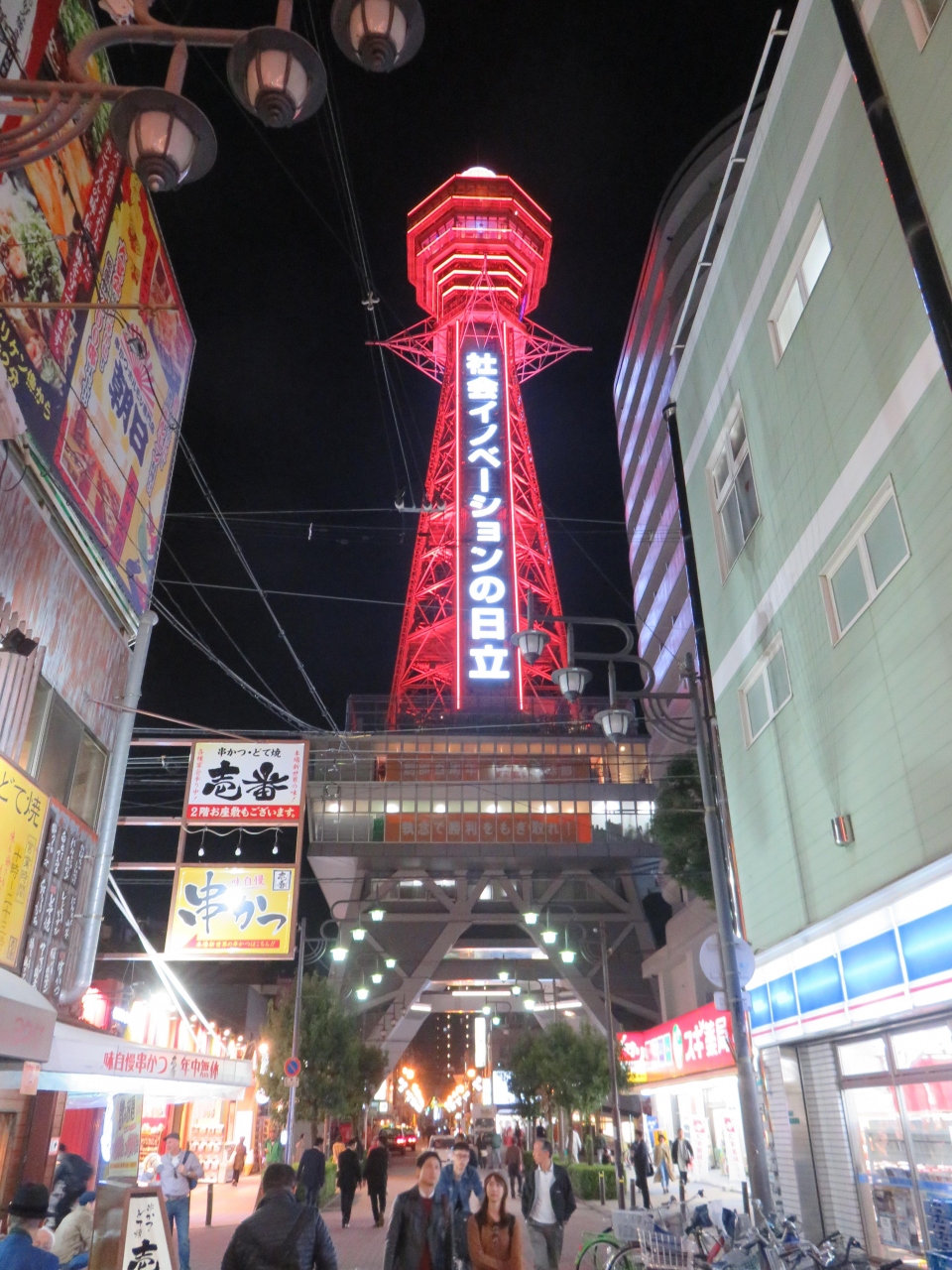 通天閣には上がっていないが、天王寺駅近辺からも見えるので、あべのハルカスと並んで、位置が簡単にわかる、便利なランドマークだ。通天閣の真下まで夕方暗くなってから歩いて行った。ネオンや看板が照明に浮かび、なかなか楽しい雰囲気だ。通天閣の真ん前にある串カツ店で飲んで食べた。ほろよい気分で通天閣を見上げるのもなかなかいい。