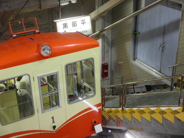 黒部平から、黒部湖に向かう赤とクリーム色のツートンカラーのケーブルカーです。普通なら、下の景色を見ようと場所の取り合いが熾烈になるのですが、雨なので「木々の紅葉が少し始まっているな」くらいしかわからないという感じでとても残念でした。晴れてたら黒部湖が綺麗に見えるはずです。