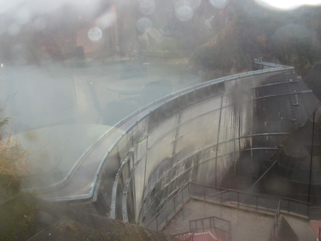 何段か忘れましたが、下からかなりの階段を上がって到着しました。この日は雨で滑るので、外には出られず、窓越しの景色しか見られませんでしたが、ここから見ると、ダムと湖が同時に見れる素晴らしい景色をゲットできます。しんどいけど必ず登って下さい。