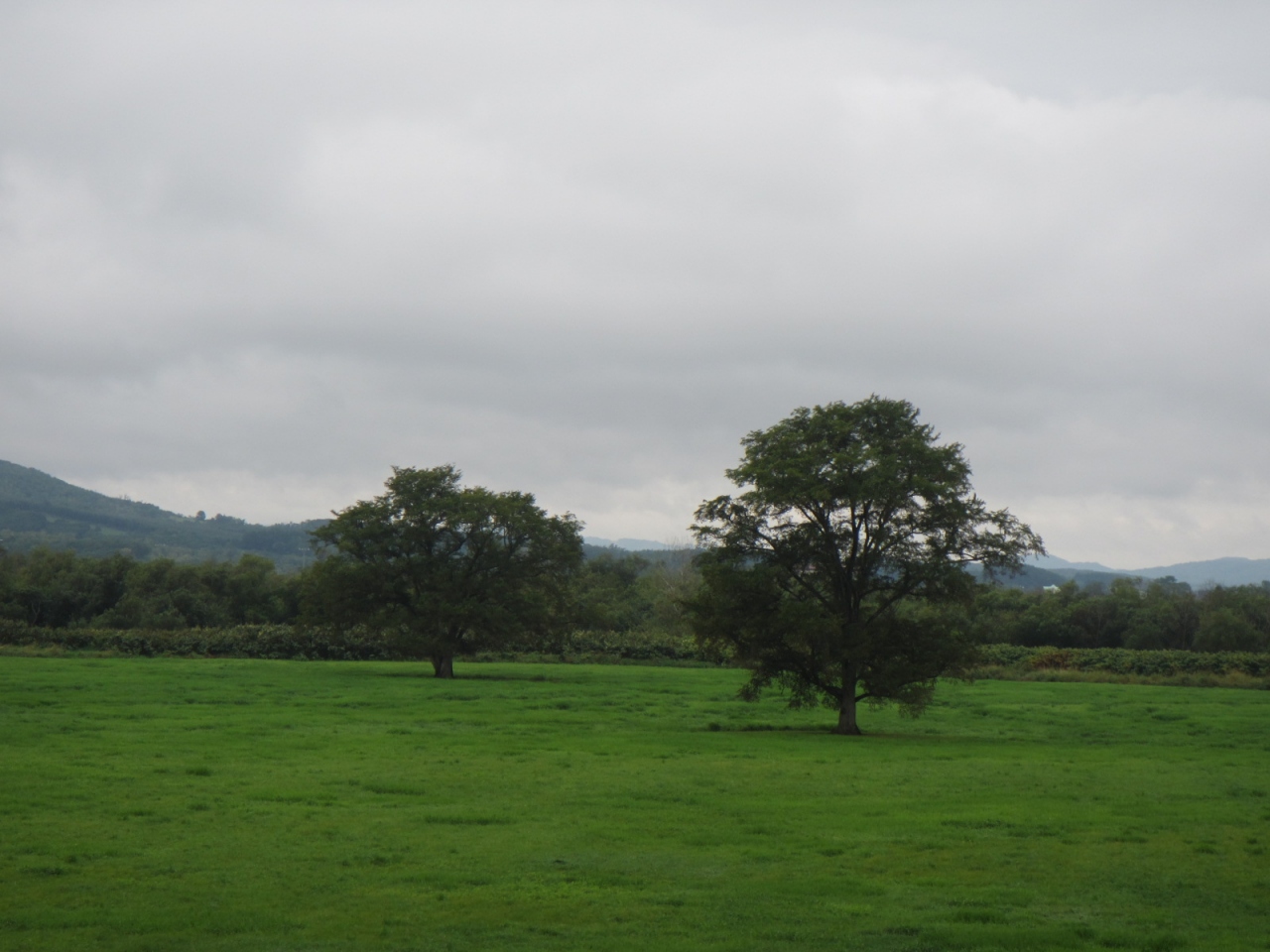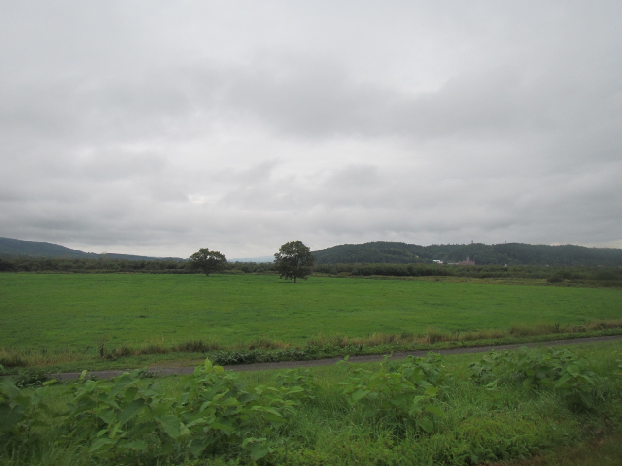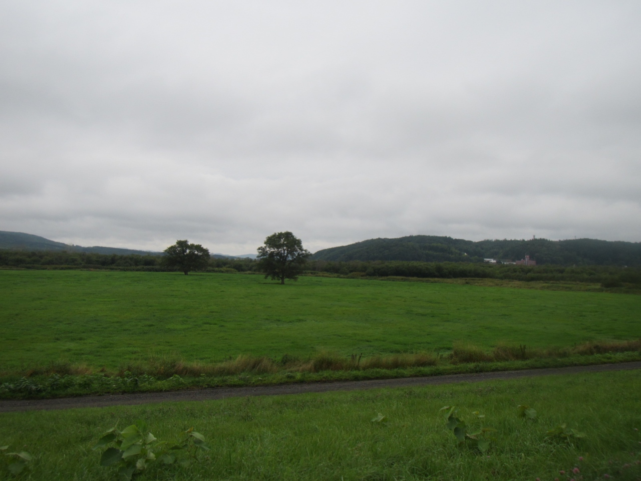 十勝川の広大な河原の草原に2本のハルニレの木がぽつんと立っています。