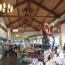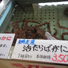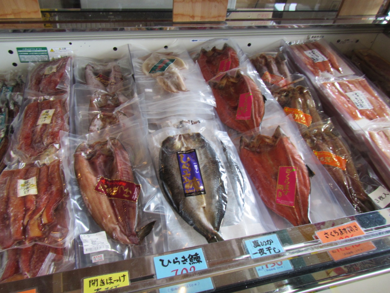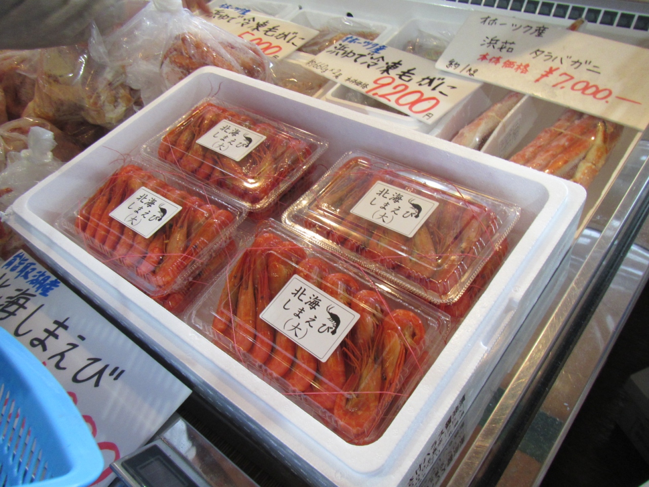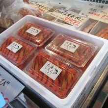 水槽には活タラバガニがいますし、魚のくんせいや干物、粕漬などの加工品など、海産物も目立ちます。