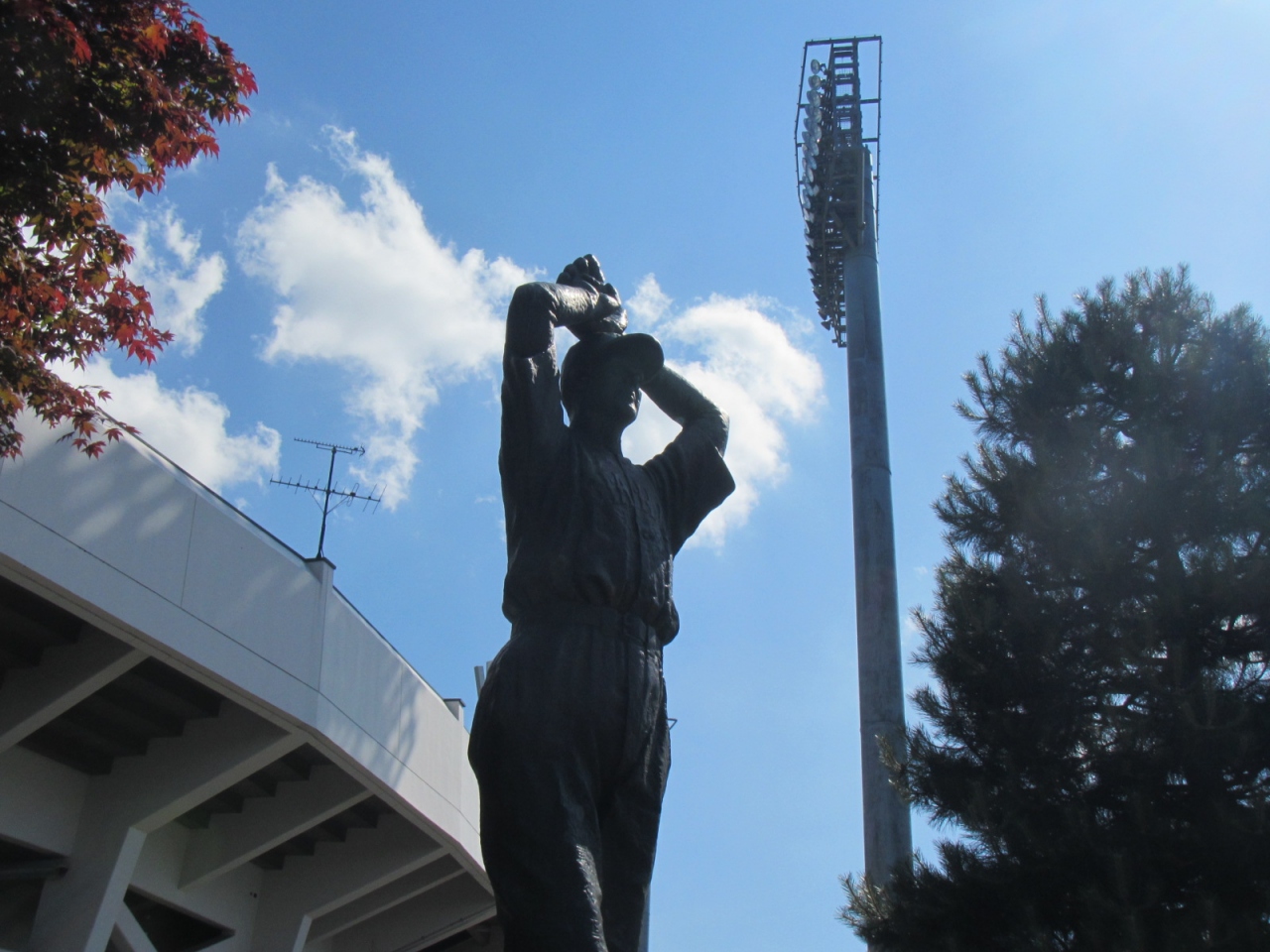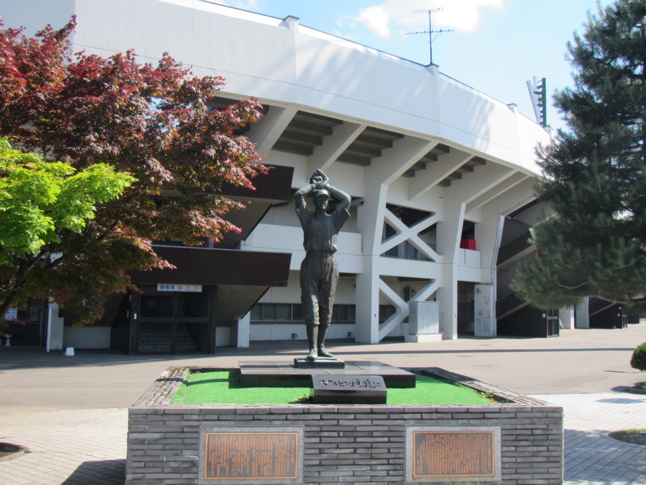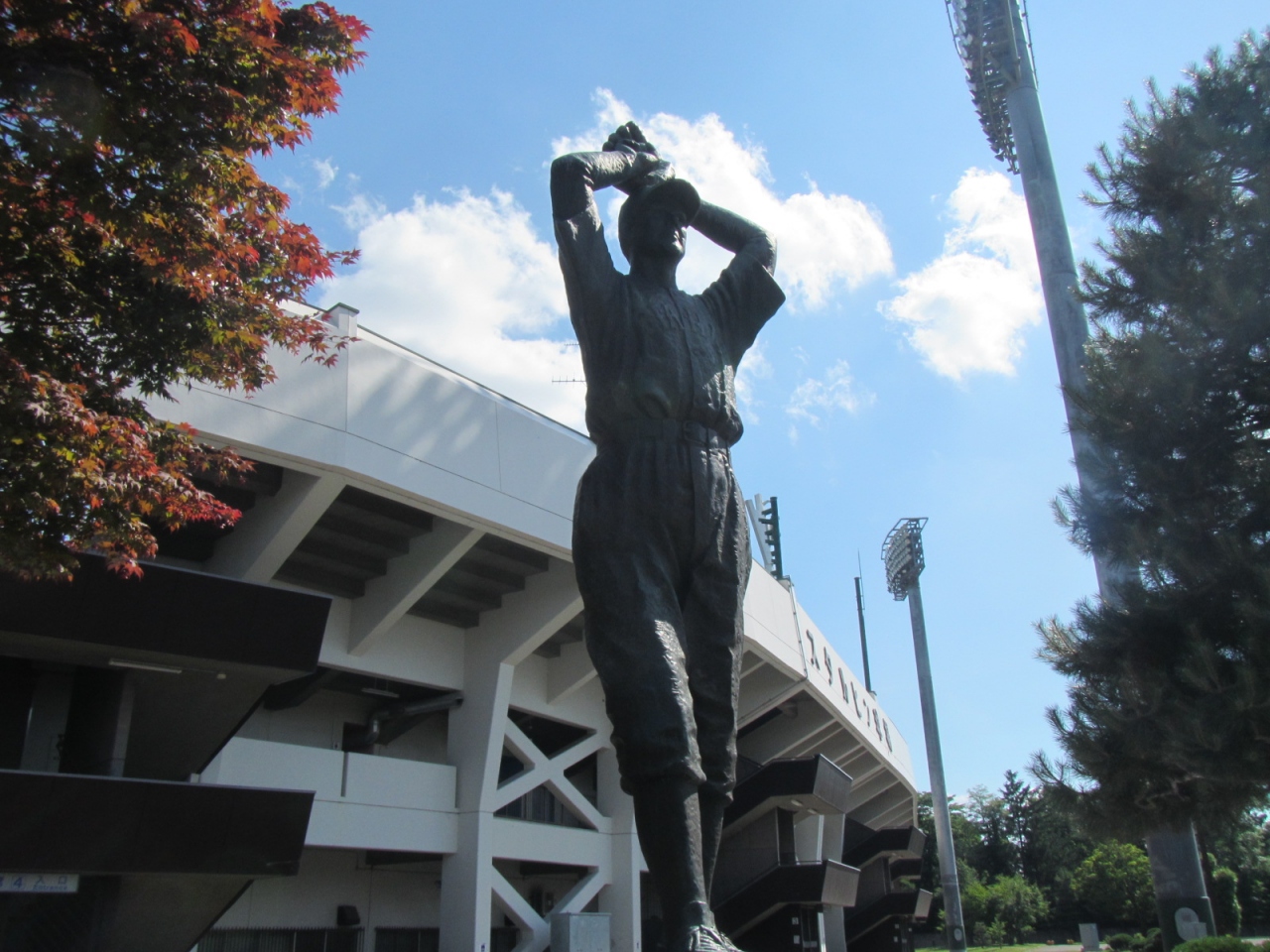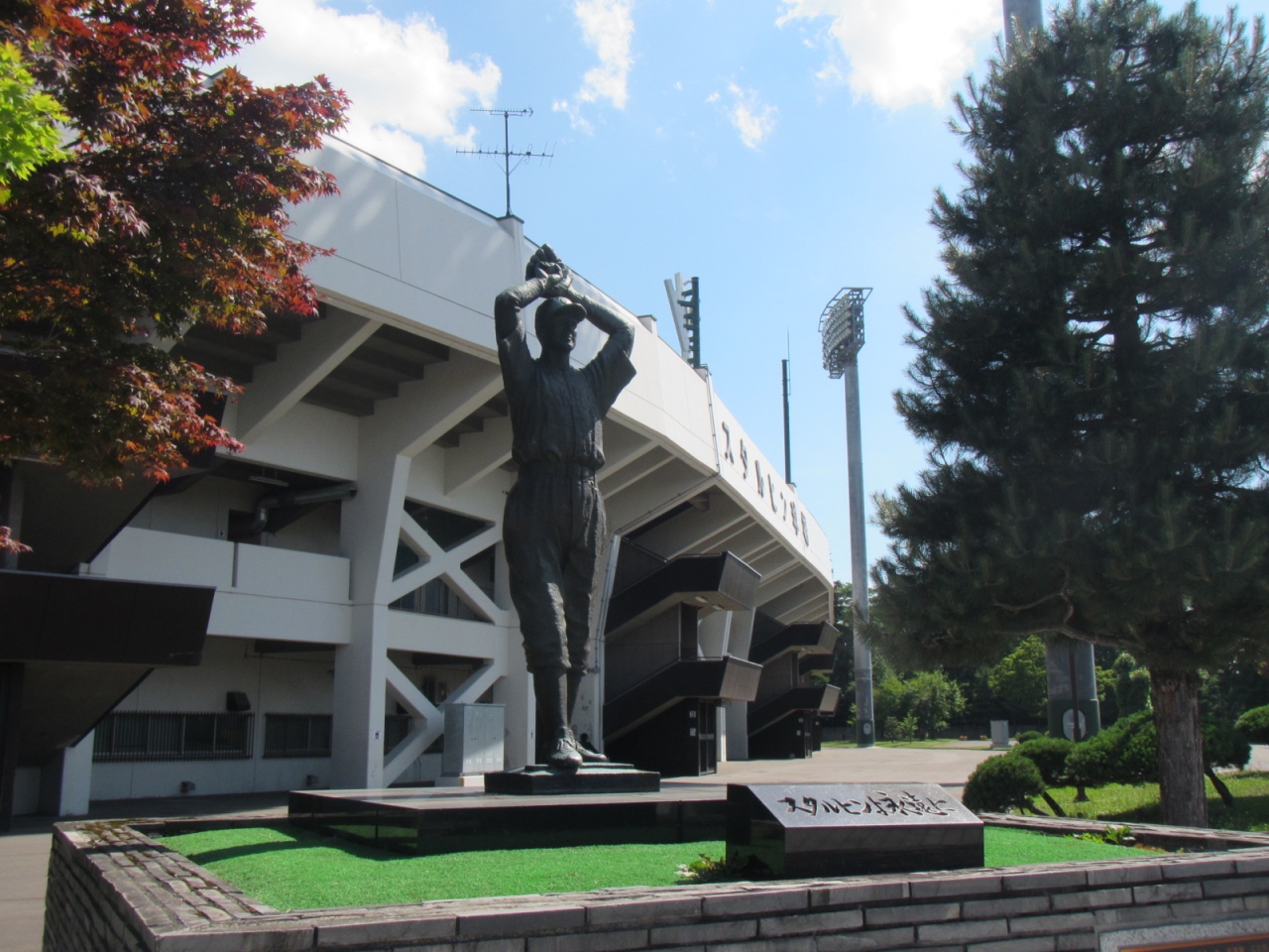 国道40号沿い、自衛隊向いにスタルヒン球場があり、像は道路沿い、球場建物の前にありました。