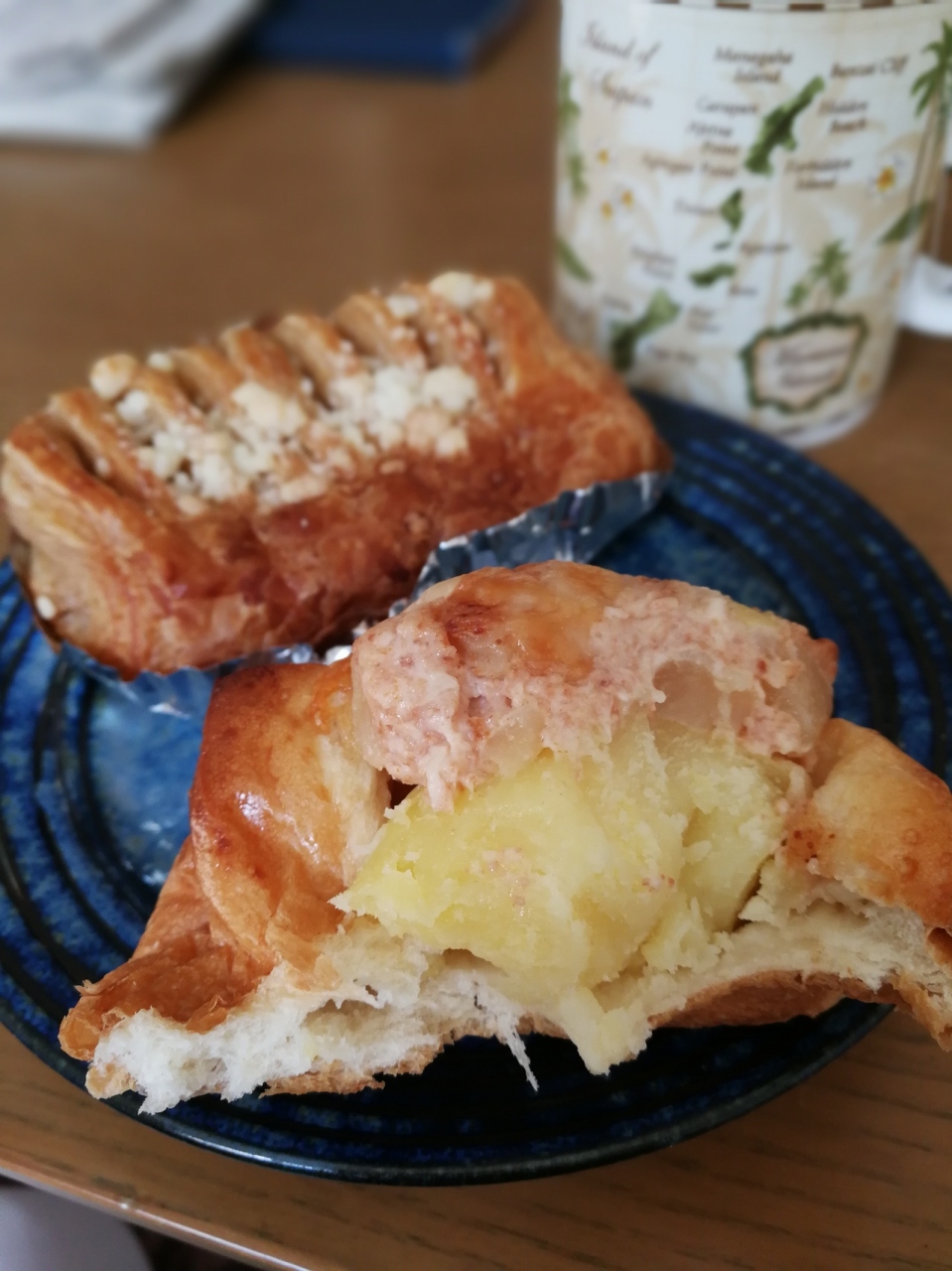 パンの種類は豊富で、サンドイッチや白身魚やメンチカツ、焼きそば等を挟んだおかずパンが気になりましたが、直ぐに食べる訳出はなかったので、メロンパンとクルミ、レーズン、クリームチーズのデニッシュ、バナナケーキ、明太子ポテトパンを購入しました。