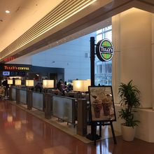 国際線ターミナル2階、到着ロビー階にあります。以前は確か別のショップが入ってましたが、今はタリーズになってました。店舗には仕切りがほとんどなく、従ってとても開放的な印象でした。単なるコーヒーショップではなく、タリーズブランドということもあって、なんとなく安心感もありましたね。ただ値段は空港価格でした。場所柄、外国人の姿も多く見受けられます。カウンター席にコンセント有り。
