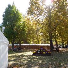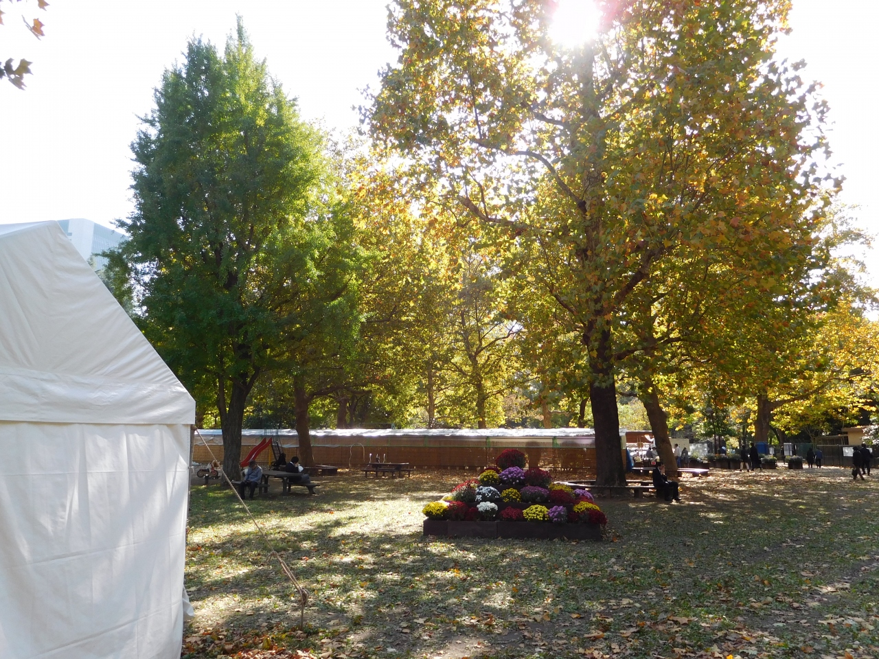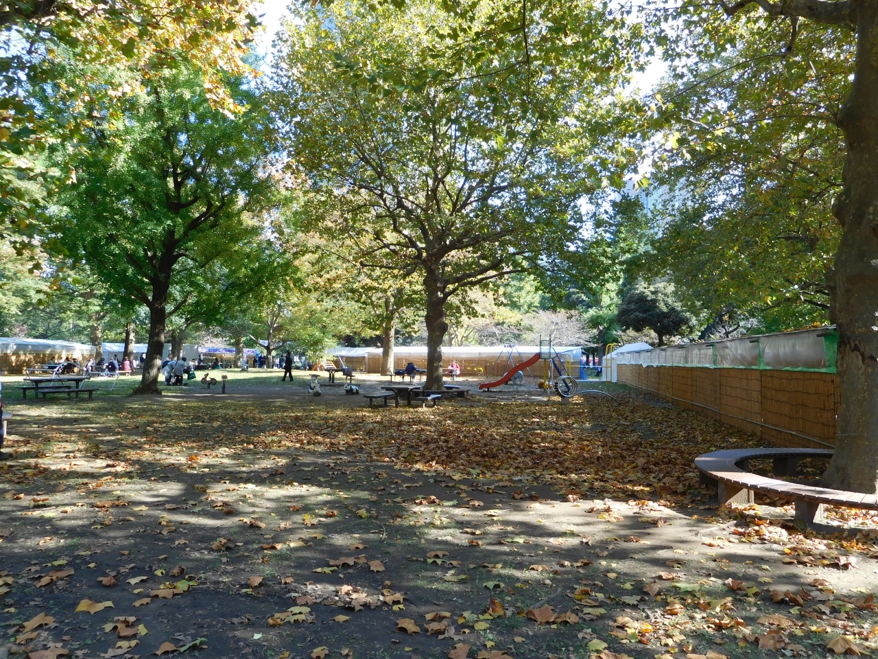 日比谷公園の中程にある広場で、周囲はフェンスに囲まれています。11月に訪れた際は、ちょうど、「東京都観光菊花大会」の期間中で、見事な菊の展示がありました。広場の中央付近には、子供達が遊べるように遊具が設置されていました。また、ベンチも多くあるので、のんびりとくつろいでいる大人の姿もありました。木々が紅葉していて、綺麗でした。