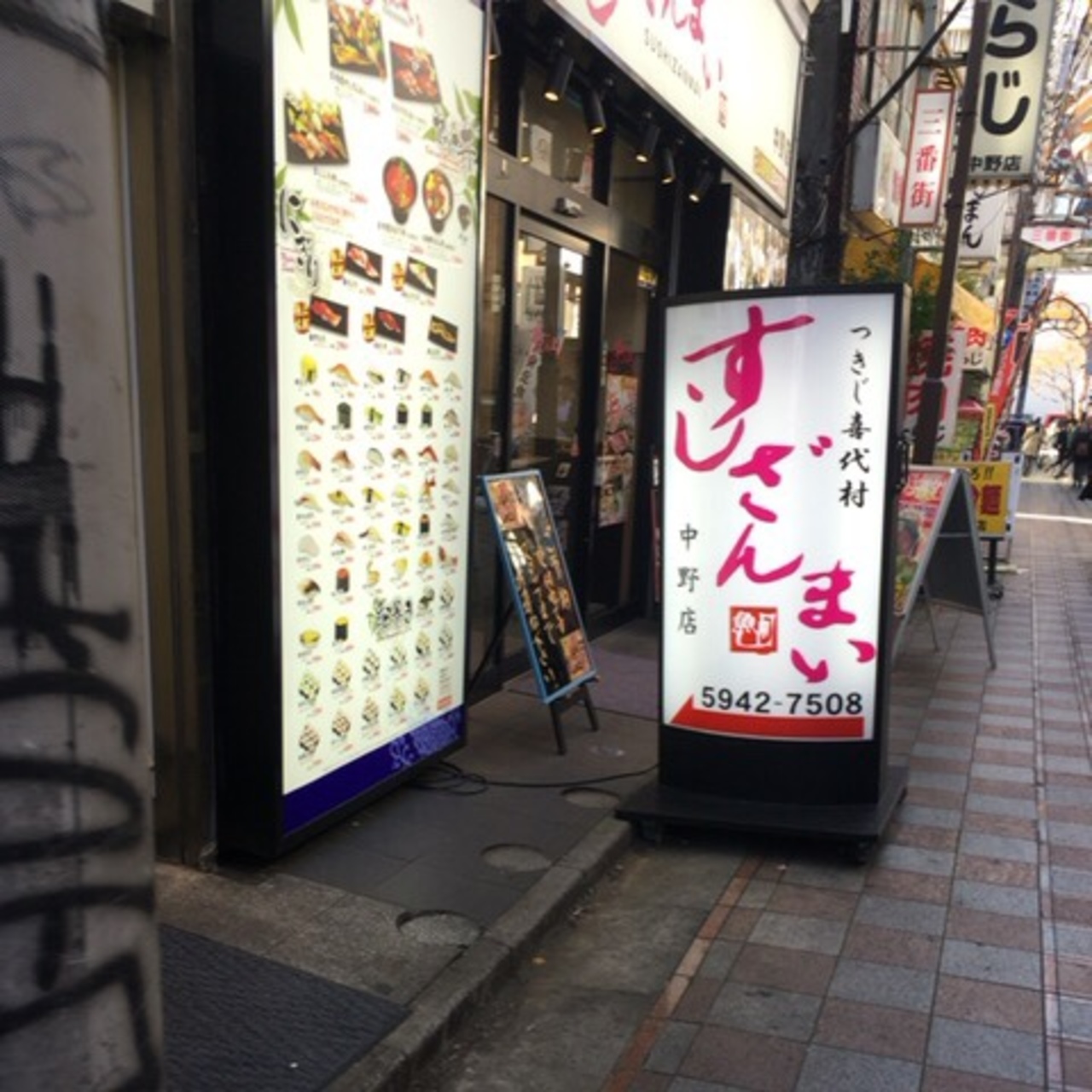 中野駅北口から3番街を歩くと大きな看板が見えてきます。