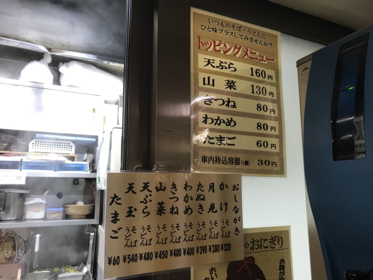 一番安いかけうどんは320円で、トッピングなどもできるようです。社内持込容器30円と書いていたので、車内でもうどんやそばを食べれるのでしょうね。味は、シンプルで寒い時期は体が温まること間違いないです。