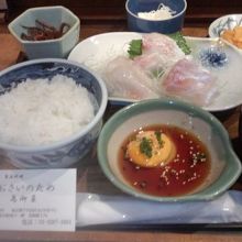 店内は靴を脱ぎ、掘りごたつ式のテーブルでいただくスタイル。ランチ時ながらくつろいで食事をいただくことができる。愛媛フェアで宇和島の鯛めしをやっていたのでこれを注文。東京にいながら四国の味を手に入れることができた。