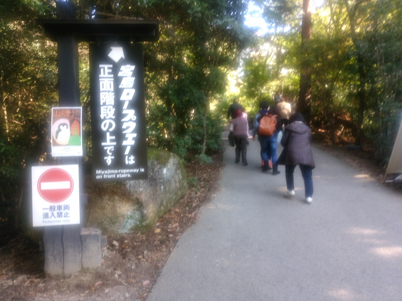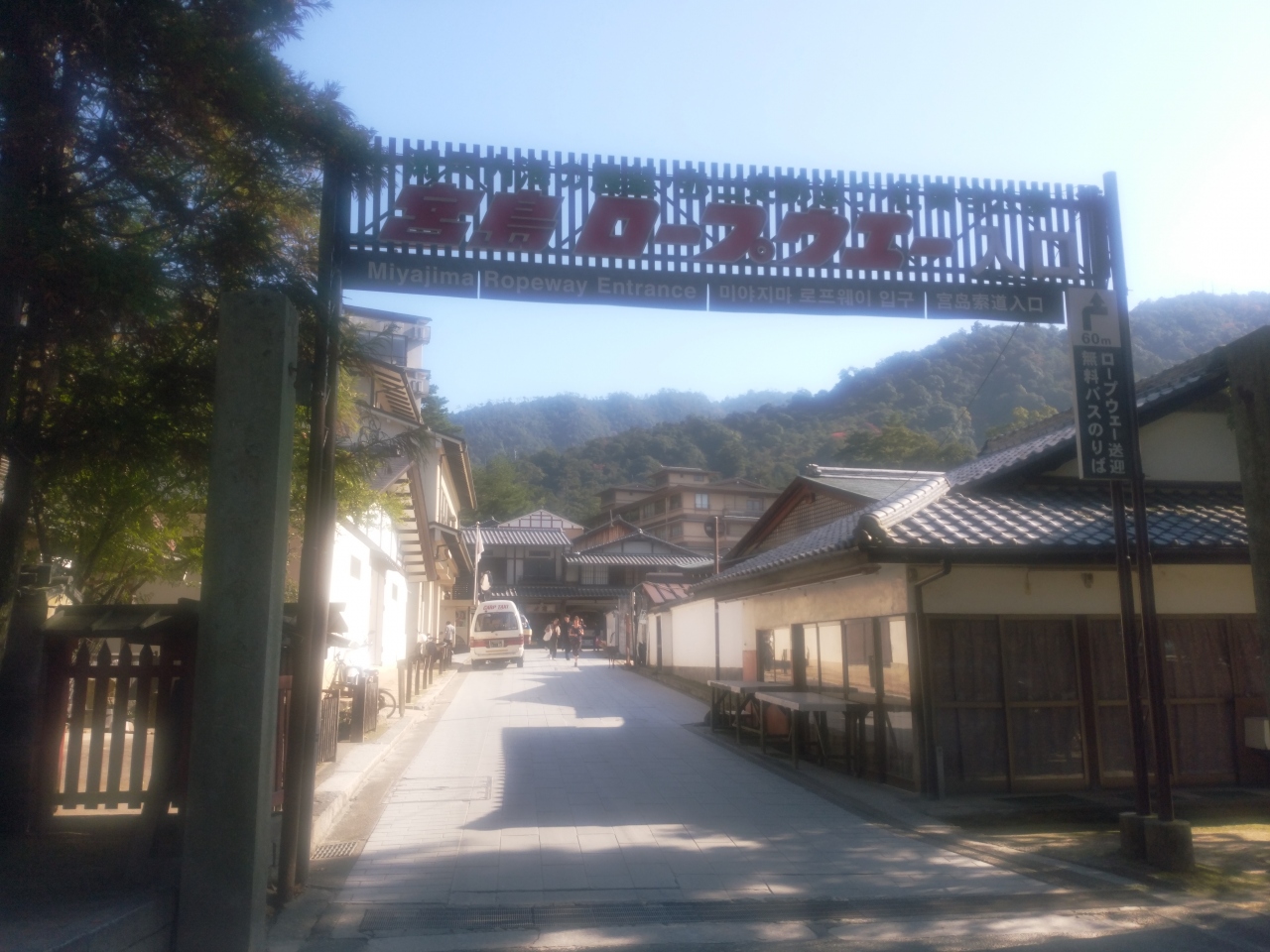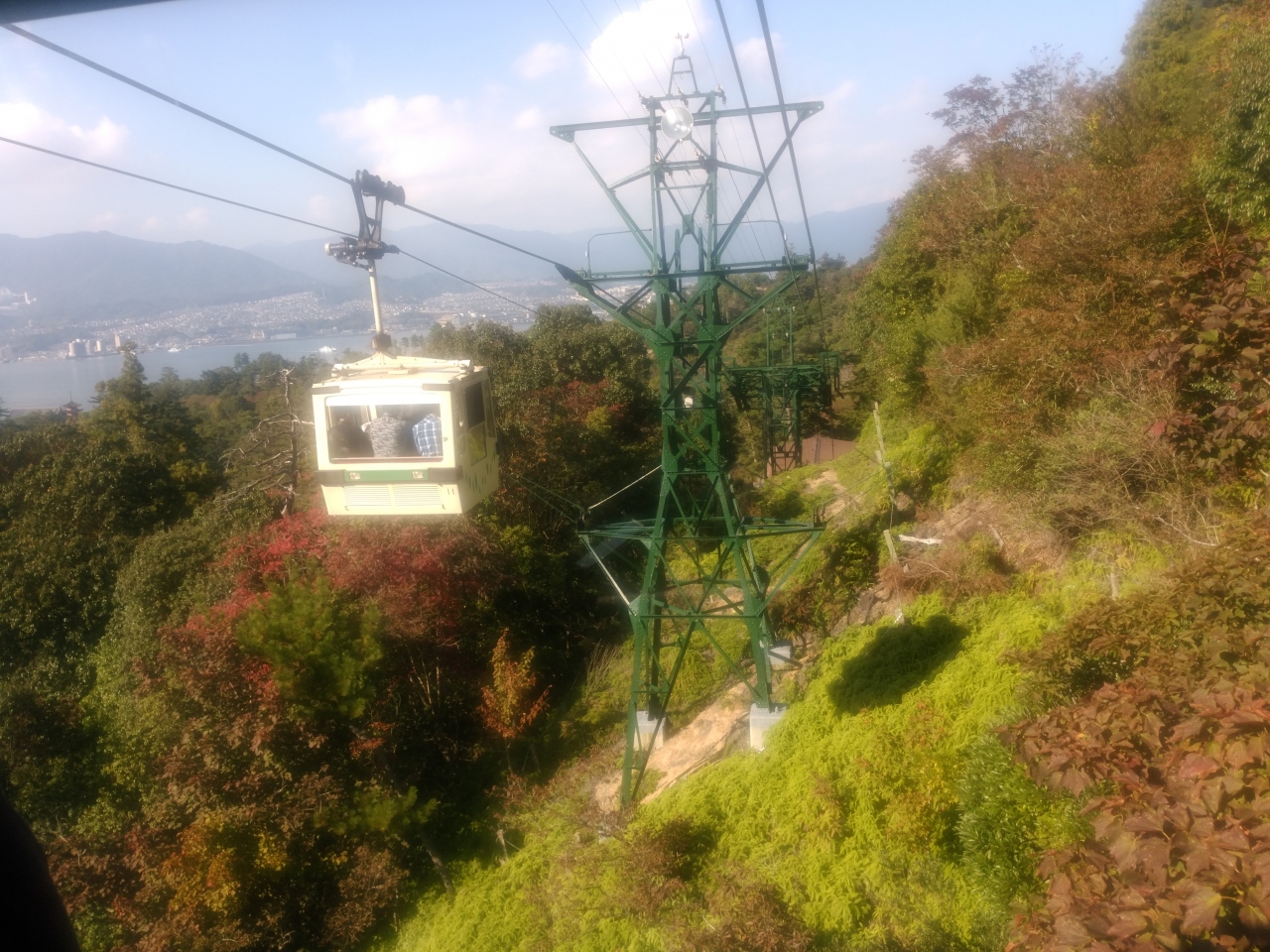 本殿からの帰り道に三翁神社がありますが、その横にロープウエイ乗り場の看板があります。そこから少し歩くと「岩惣」と言う旅館の前にロープウエイのへの乗船券が販売されており、その少し先にある無料送迎バスに乗っていくとロープウエイ乗り場に到着します。バスは満員で外人が多かったです。ロープウエイは紅葉谷駅から榧谷駅迄は循環式で最大8人乗り(全員が着席できます)、榧駅から獅子岩駅迄は交差式で30人乗り(ロープウエイには28人乗りと記載)の乗り換え着席は一部で殆どは立った状態で14分で到着します。ロープウエイからの景色は空中散歩と呼ばれるだけあって素晴らしい景色でした。でも30人乗りのロープウエイはほぼ満員で出発する為乗る位置によっては絶景が見られないかも。見られない場合は、帰りのロープウエイが空いているので見て下さい。
