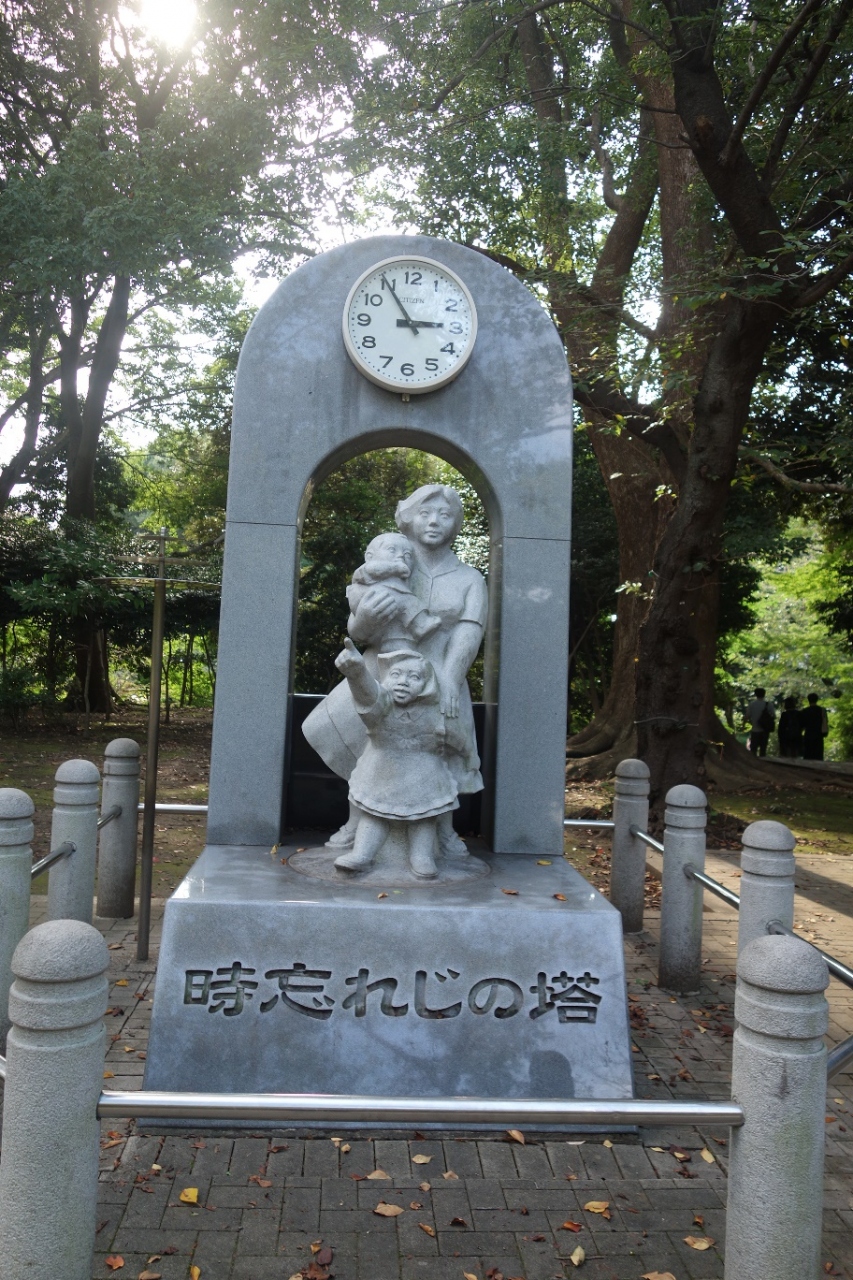 上野駅から近い上野公園の緑が多い散策道の一角に有る塔です。時忘れじの塔とは何を意味するのか解りませんでしたが、これは東京大空襲の慰霊塔だそうで、この時を忘れないという意味で立てられたのだと思います。母子の像の上に時計が設えてありました。