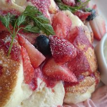 パンケーキ、ほぼメレンゲ。口の中に入れると溶けてなくなります。好き好きでしょうが私はもうちょい食間がある方が好き。
