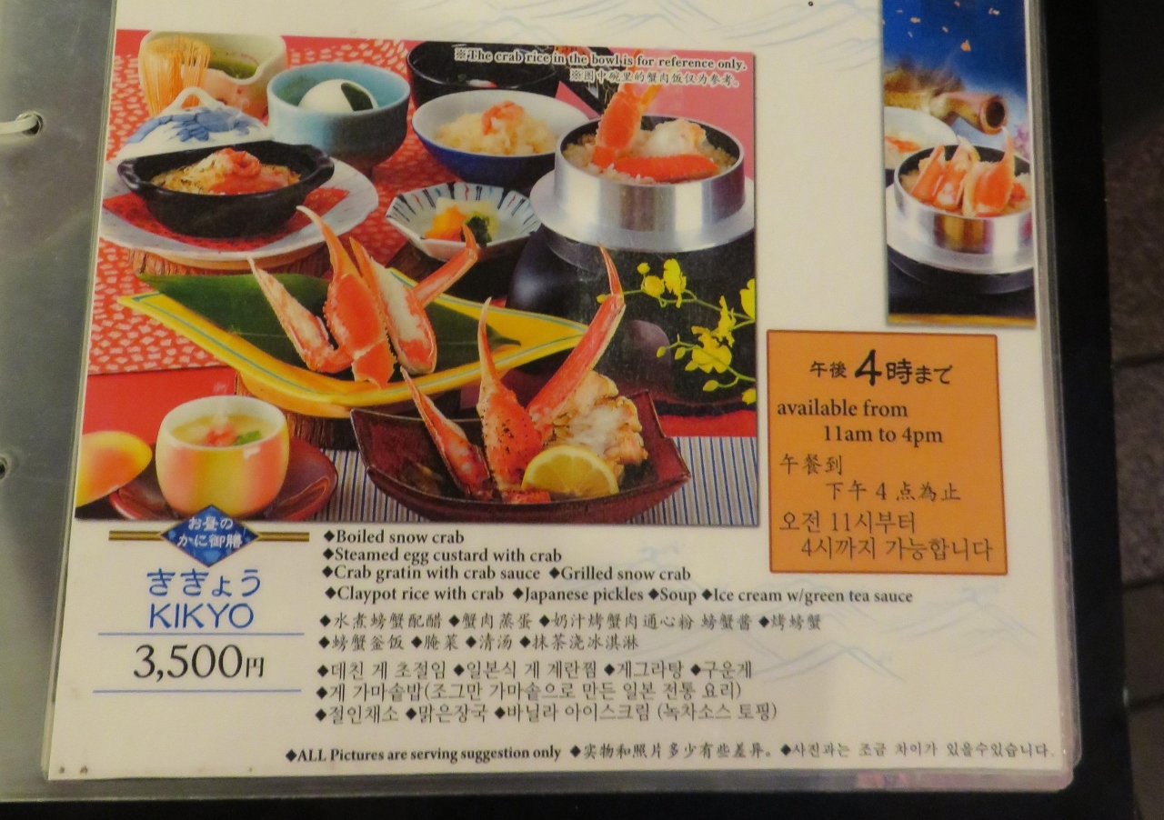 カニは店の前で販売している焼きカニが実は一番おいしかったが、店内で食べたコースも、いろんな食べ方が体験できて、楽しい食事となった。カニ釜飯が気に入った。