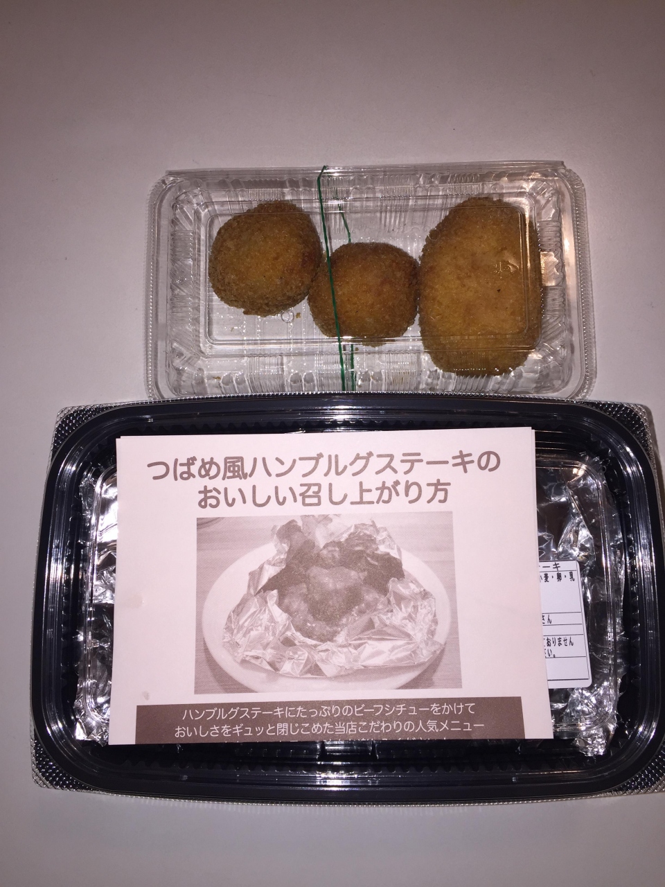 エキュート内のつばめグリルで、テイクアウト用のハンブルクステーキを買って帰りました。これで、家でもハンブルクステーキです。きちんとアルミホイルに入っていて、温め方法が記載された説明書も添付されています。なので、誰でも簡単にです。ちなみにハンブルクステーキとは、つばめグリルの看板メニューで、ハンバーグの上にビーフシチューのようなソースがかかっていて、お肉もちょこんと乗っかっています。ついでにコロッケまで購入。自宅で美味しくいただきました。