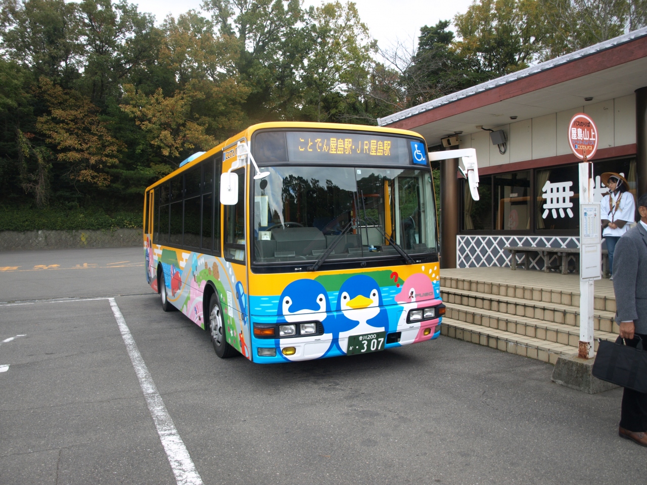 以前は有料道路だったところが無料になりケーブルが昔ありましたが、今はありません。100円で山上とことでん・JR各屋島をつないでくれるのはありがたいがいかんせん1時間に1本ではやや利用しにくい。休日は200円でもいいから本数倍にすべき