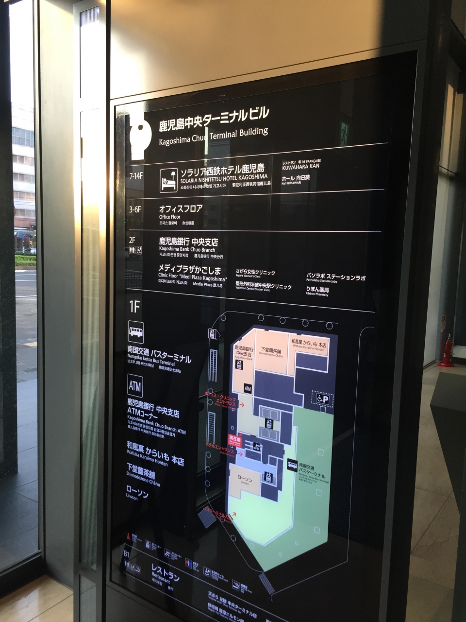 鹿児島空港からのリムジンの最初の停留所です。バスセンターがホテル、飲食店街がある綺麗なバスターミナルです。駅もすぐ近くなのでかなり便利な場所にあります。地下で鹿児島駅とも繋がっています。雨の日も楽だと思います。