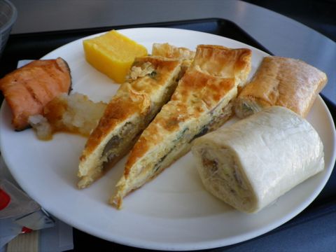 アメリカン航空のラウンジ。午前中はJALのお客さんも使えるようになっています。空いていて極めて落ち着いているので、サクララウンジが混んでいて落ち着かない時には利用します。食事は軽食中心。午前中はJALが準備したらしい和食も用意されています。
