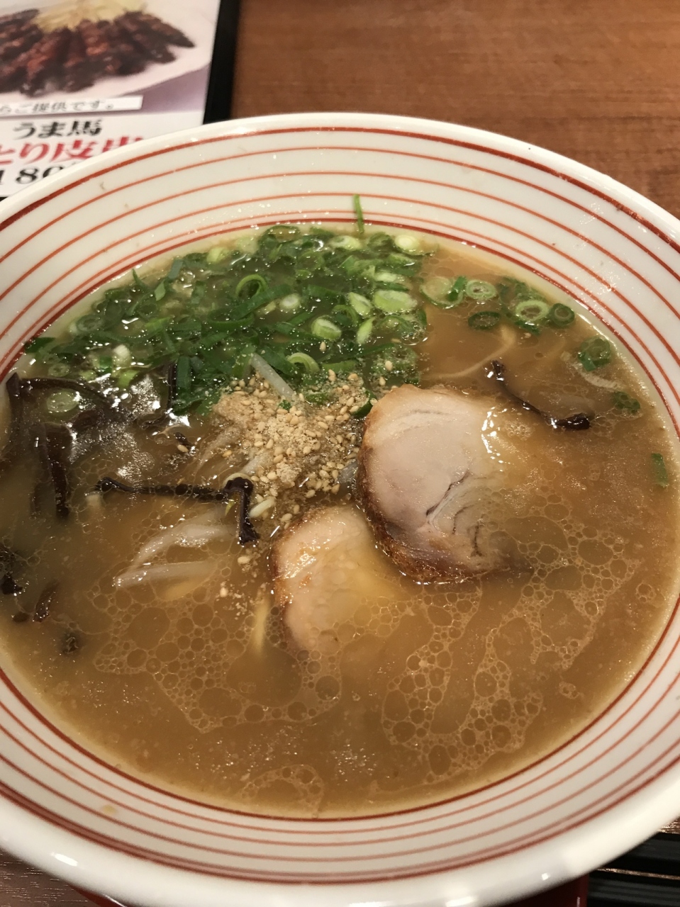 渋谷ヒカリエのレストラン街にある、博多ラーメンのうま馬です。博多ラーメンが800円と強気な値段です。麺が細麺ではなくパスタのようなヒラ麺。スープに絡まず、違和感しかないです。麺の量も少ない。男性はこれで満足出来るのか疑問です。