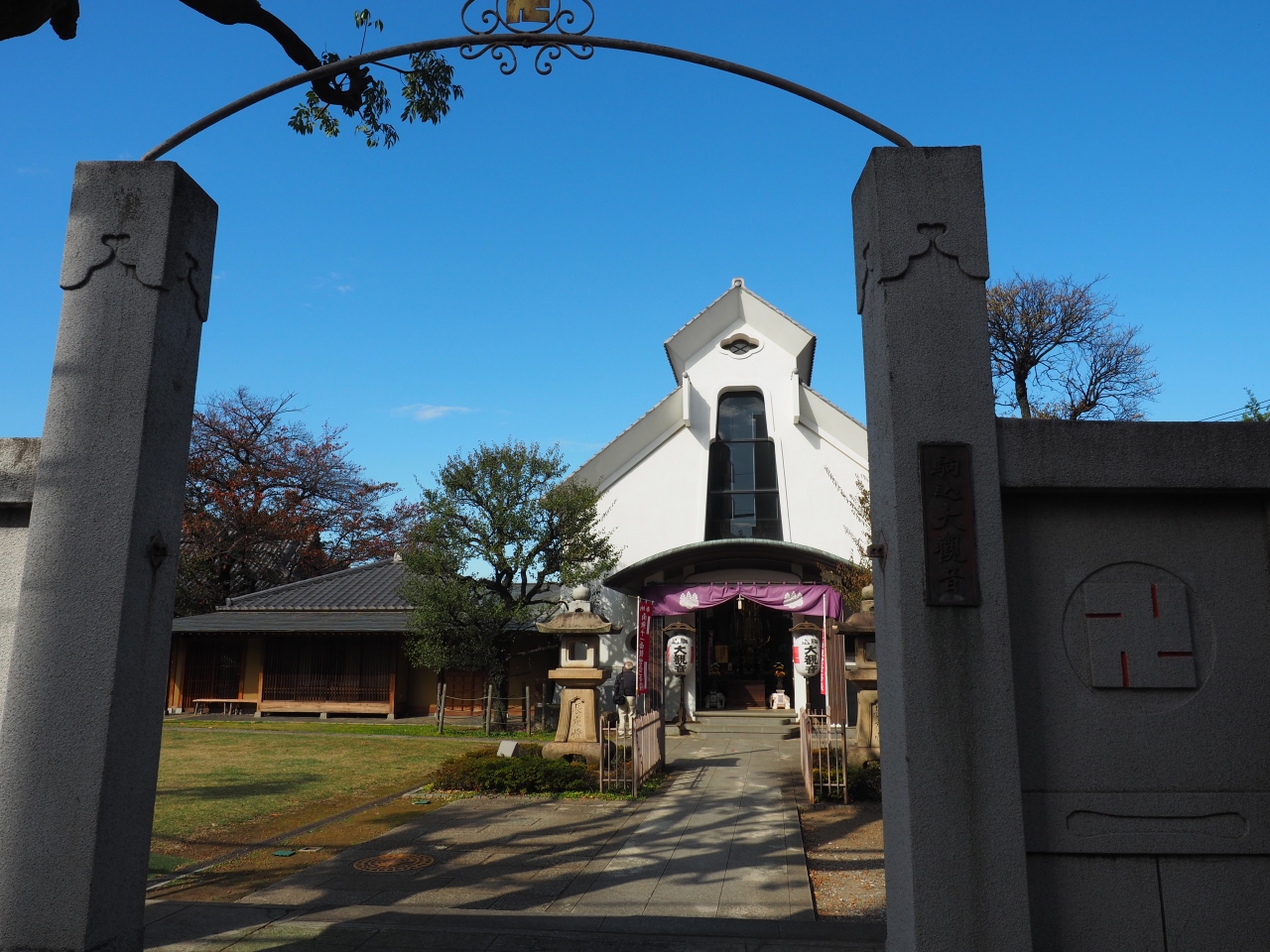 本駒込駅から徒歩数分のところにあります。一瞬、教会?と思ってしまうような屋根の形のとても変わったお堂があり、その中に金色の観音様がいる、すごく不思議な無国籍な雰囲気のお寺です。境内も公園みたいに広くてがらんとしていて、お寺っぽくないのが逆にいい雰囲気でよかったです。